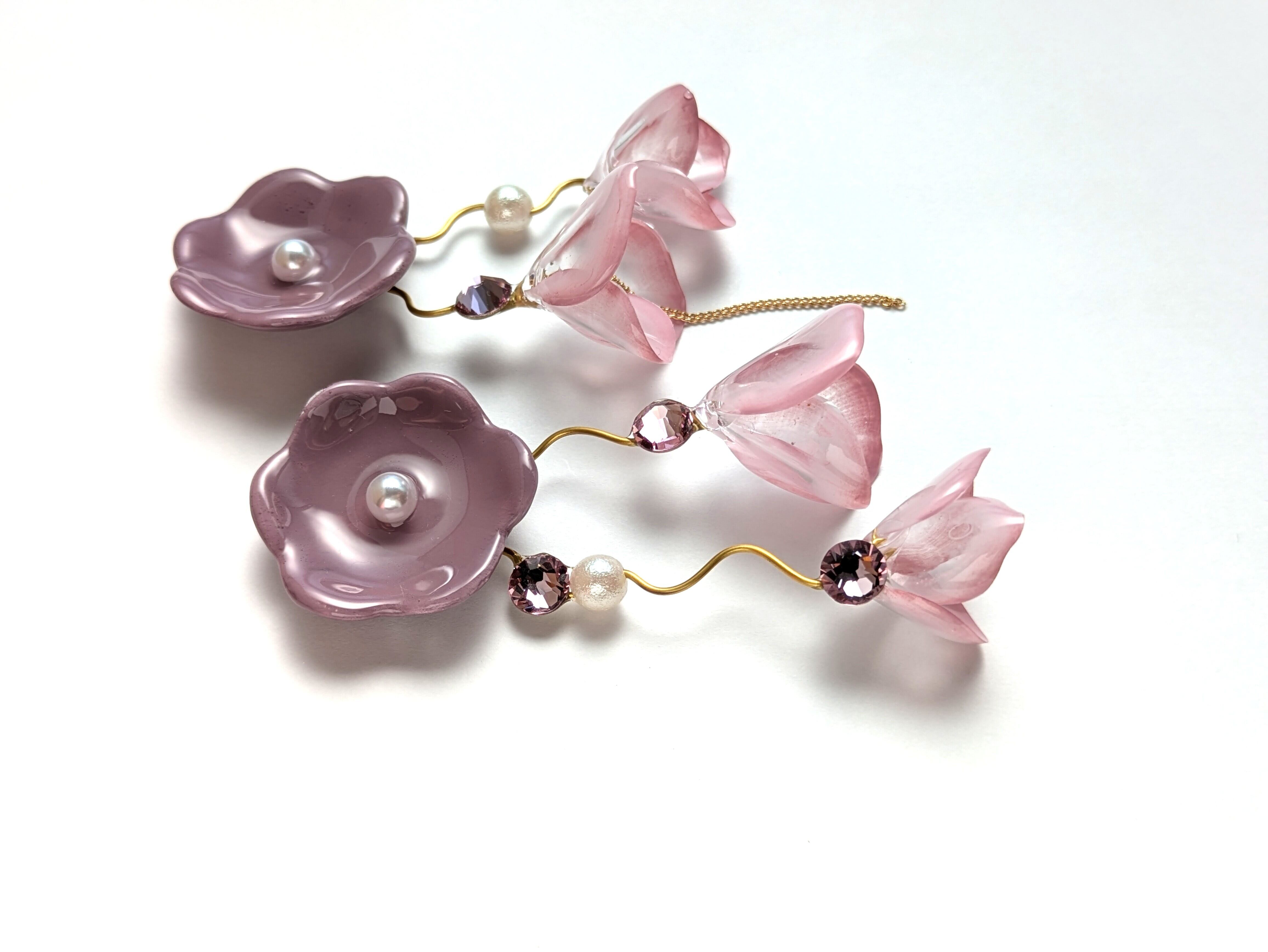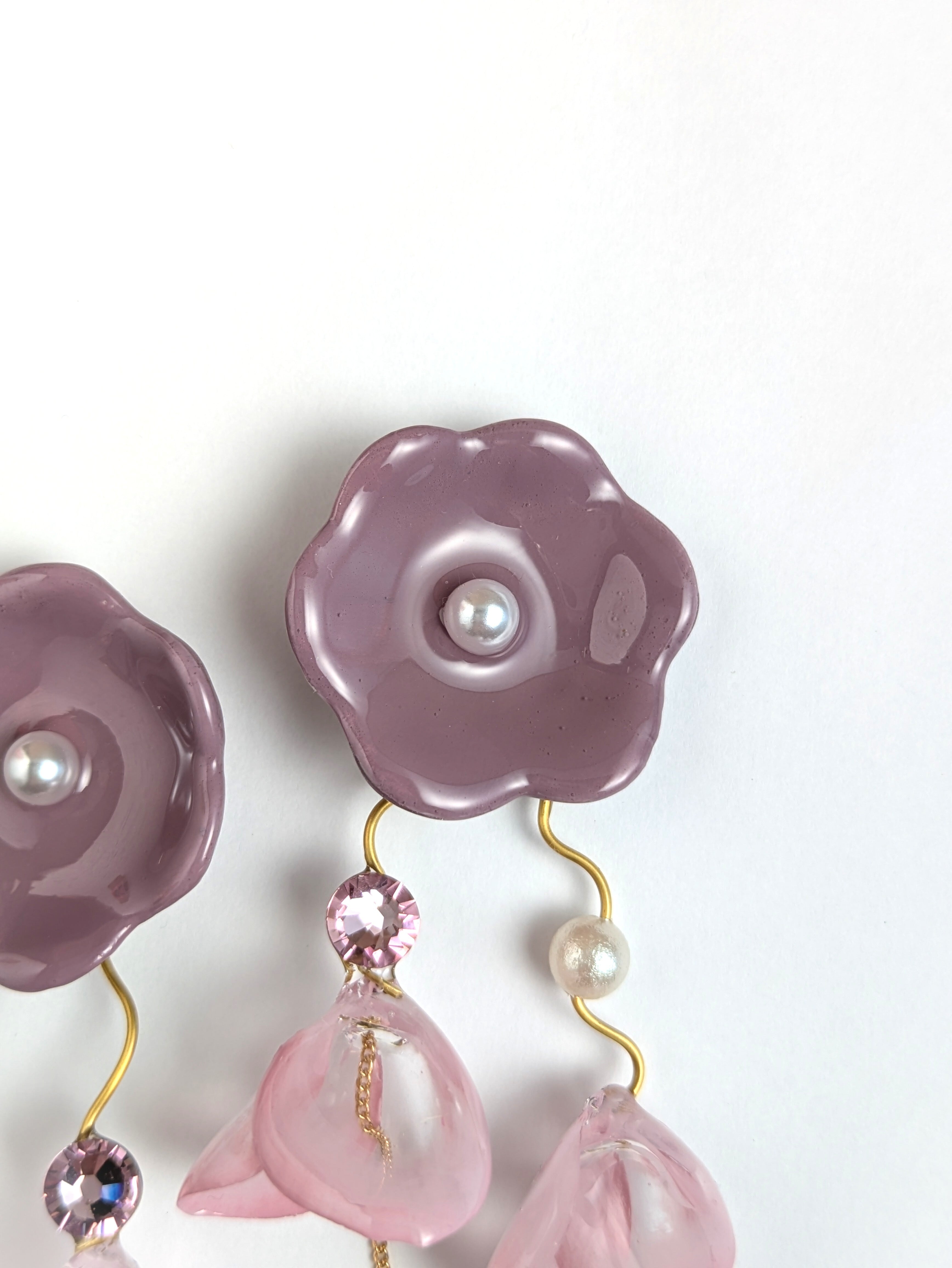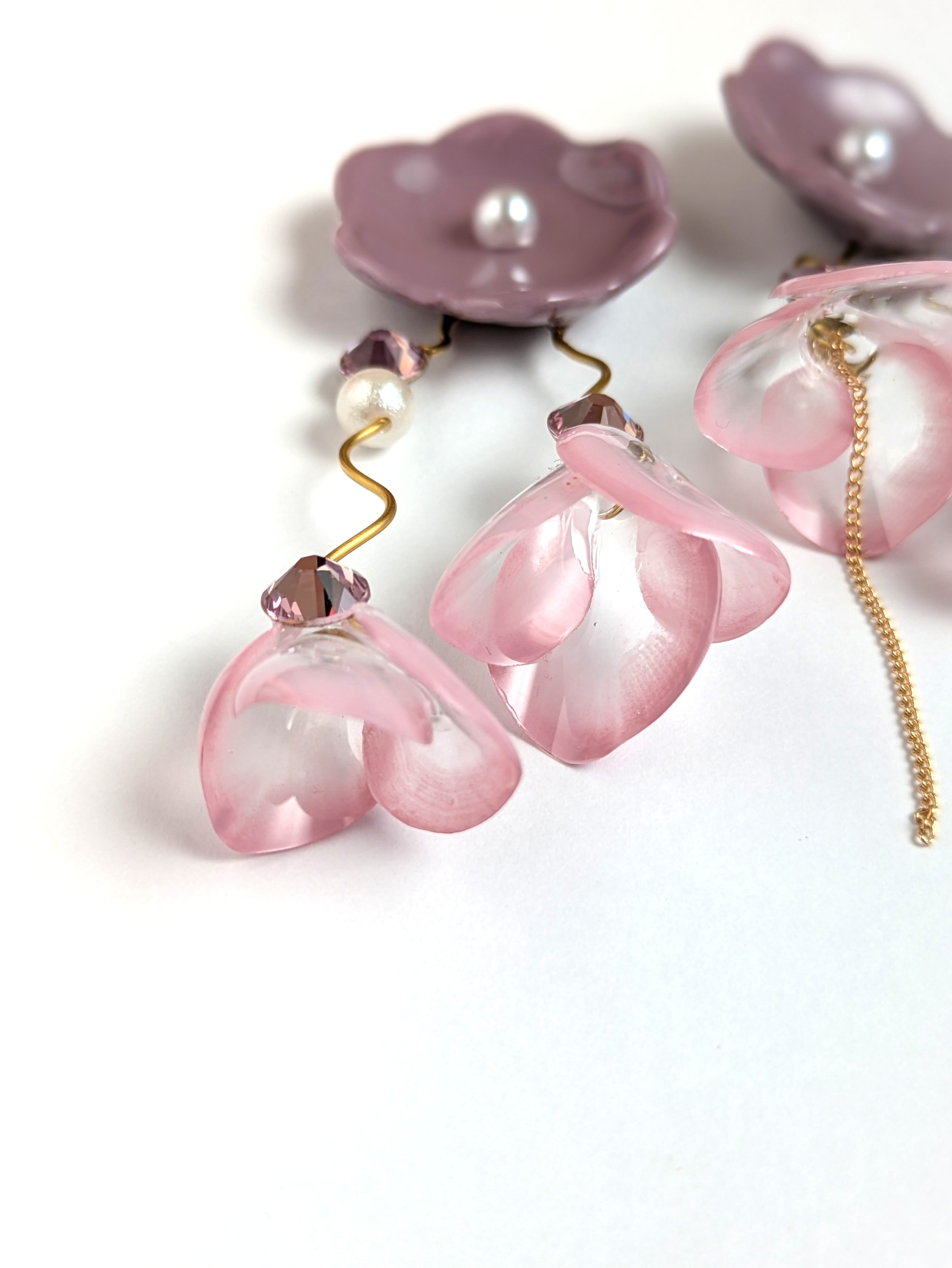 スモーキーなピンクの花が2種類咲いているタイプ。下に向かって伸びる花は一枚一枚グラデーションになるようなペイントを施してつくっています。まるいピンクのガラスパーツもキラキラと反射して幻想的な雰囲気の耳飾りに仕上がりました。