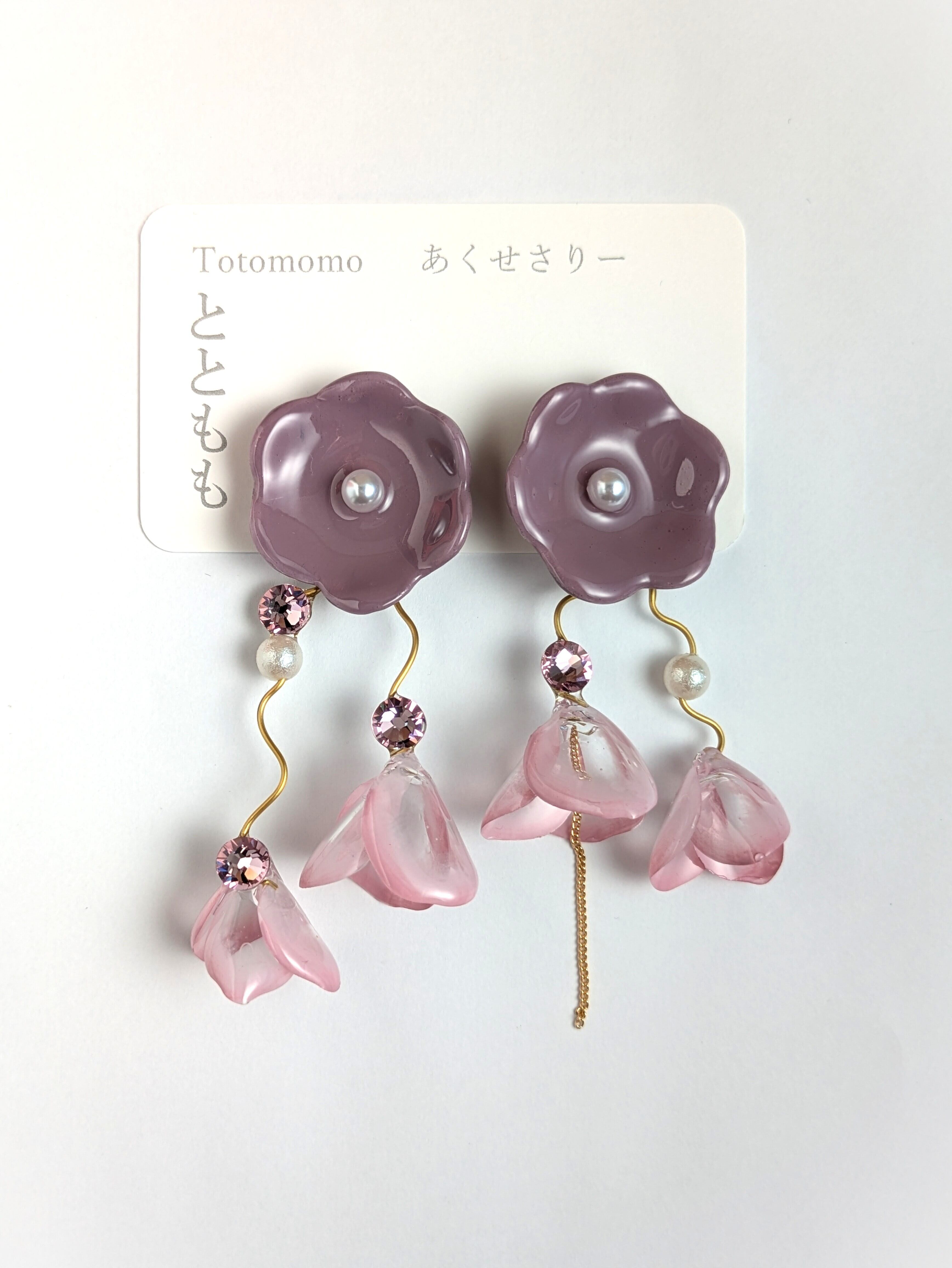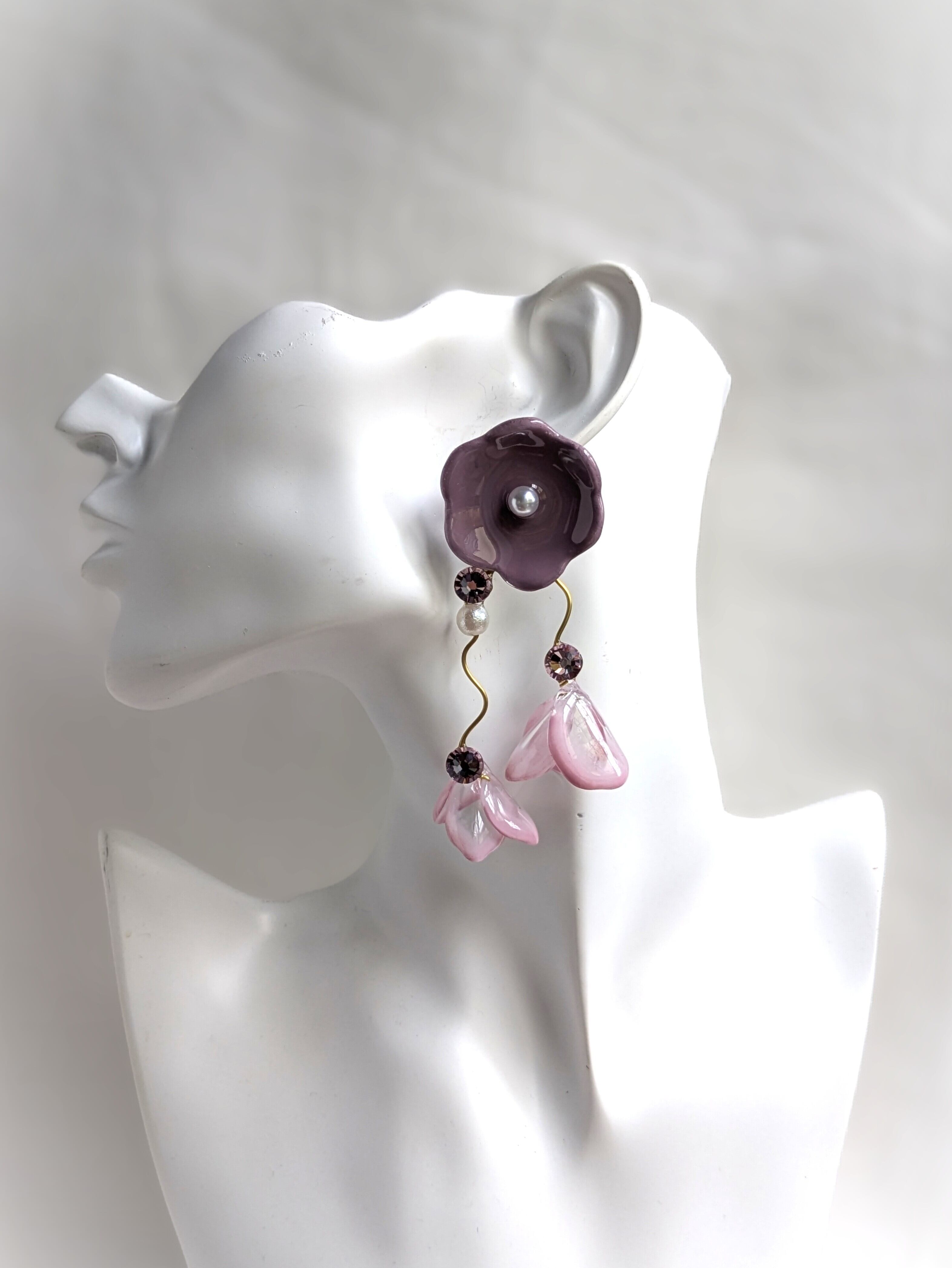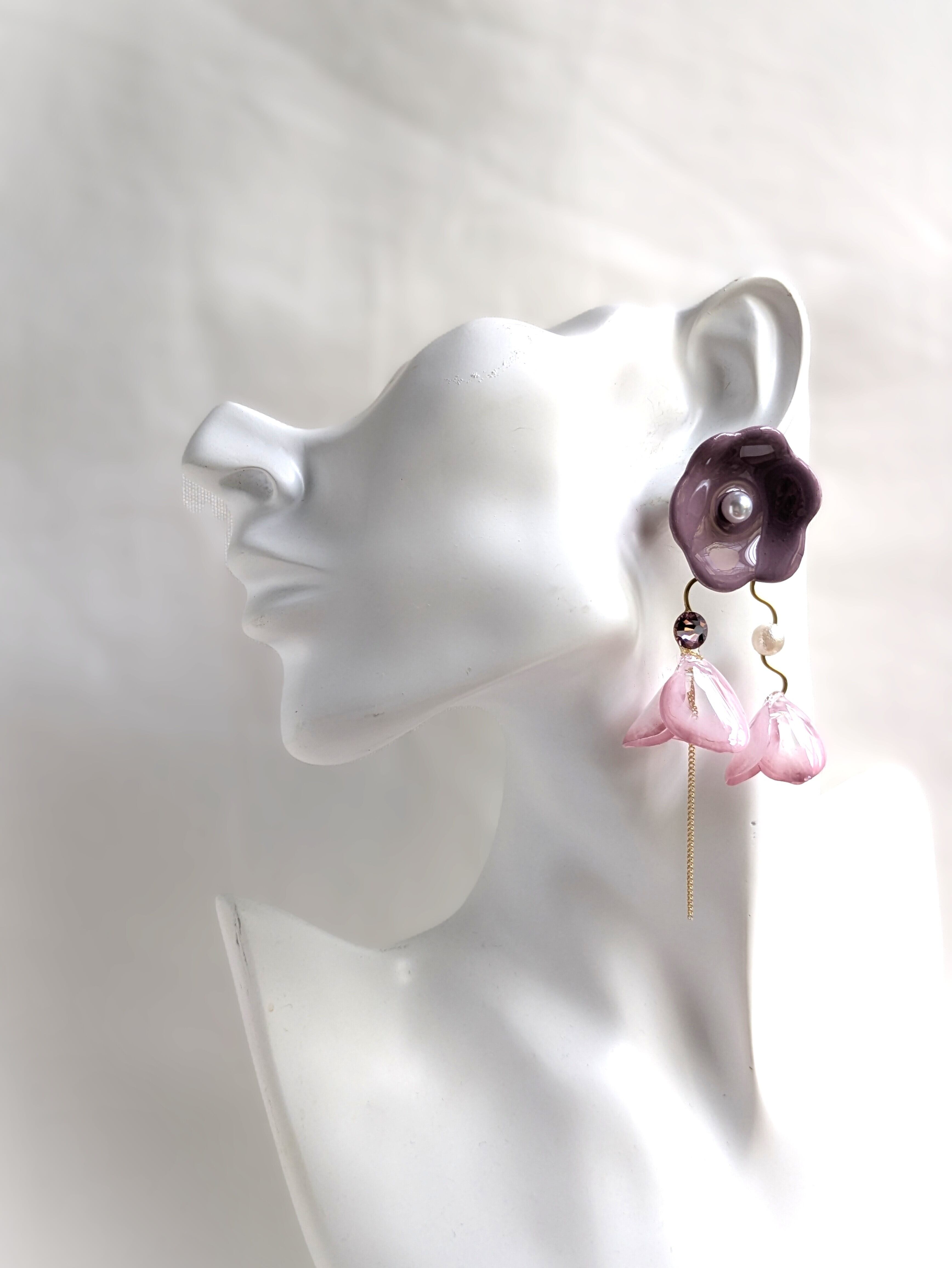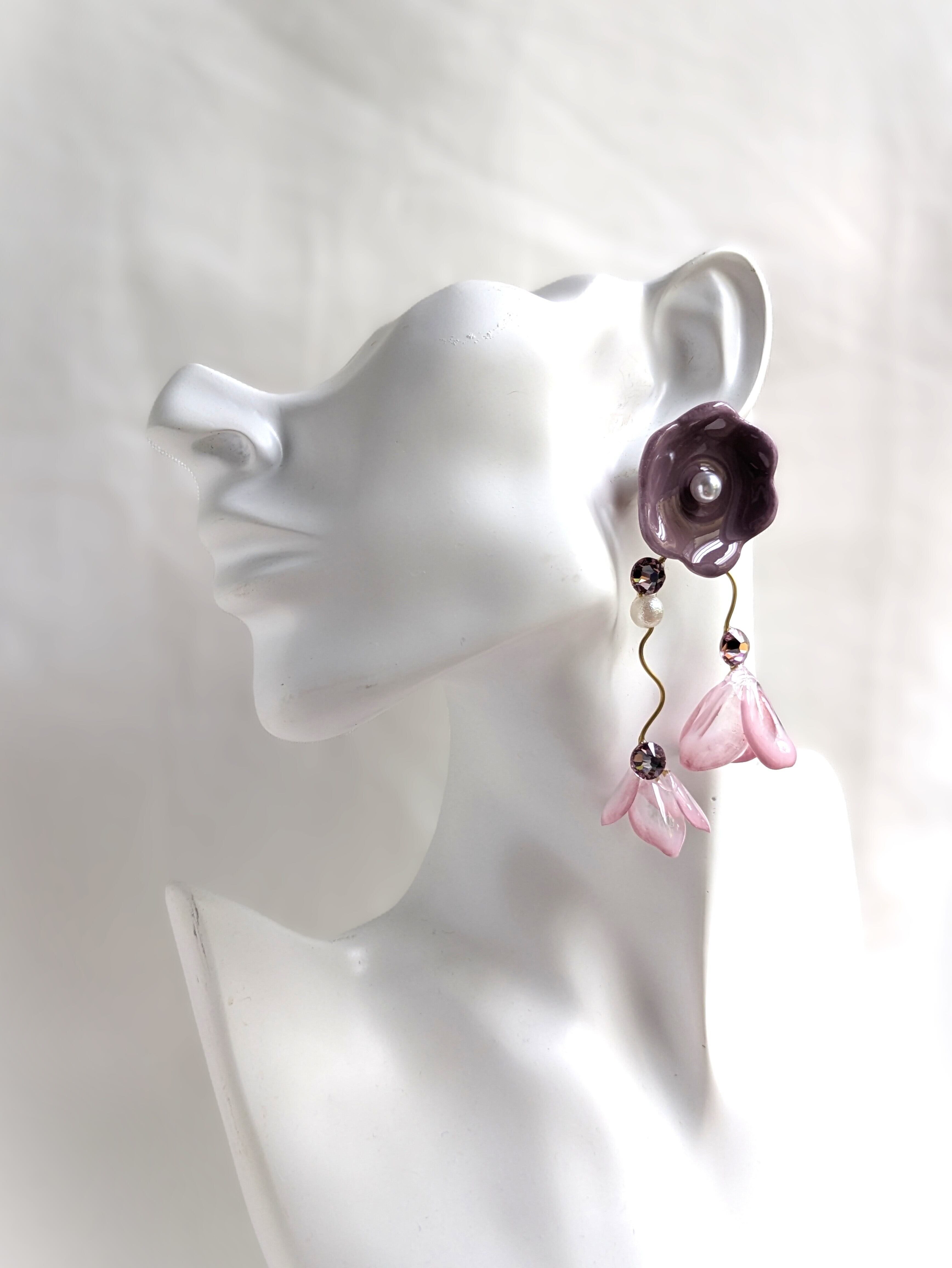 スモーキーなピンクの花が2種類咲いているタイプ。下に向かって伸びる花は一枚一枚グラデーションになるようなペイントを施してつくっています。まるいピンクのガラスパーツもキラキラと反射して幻想的な雰囲気の耳飾りに仕上がりました。