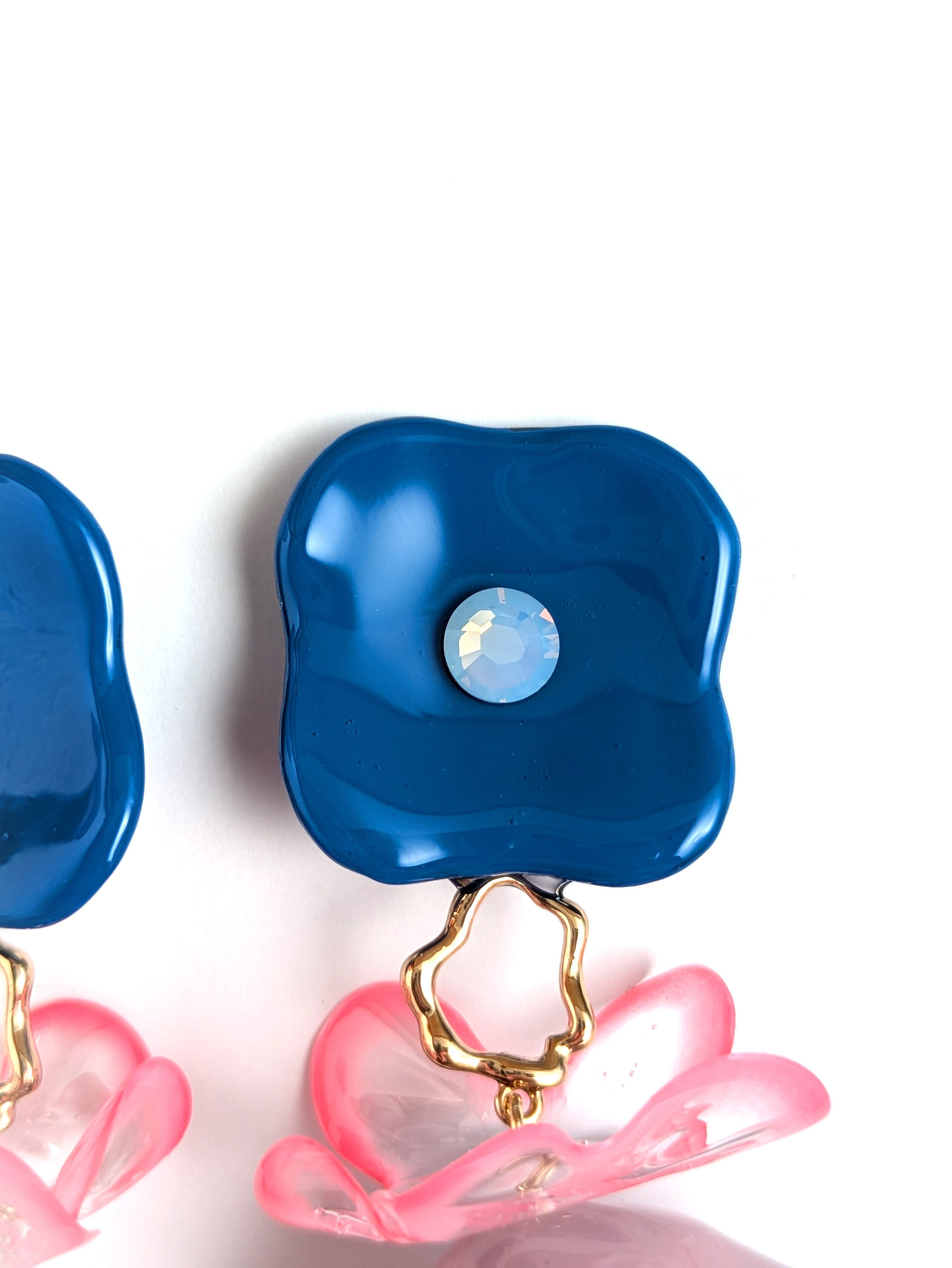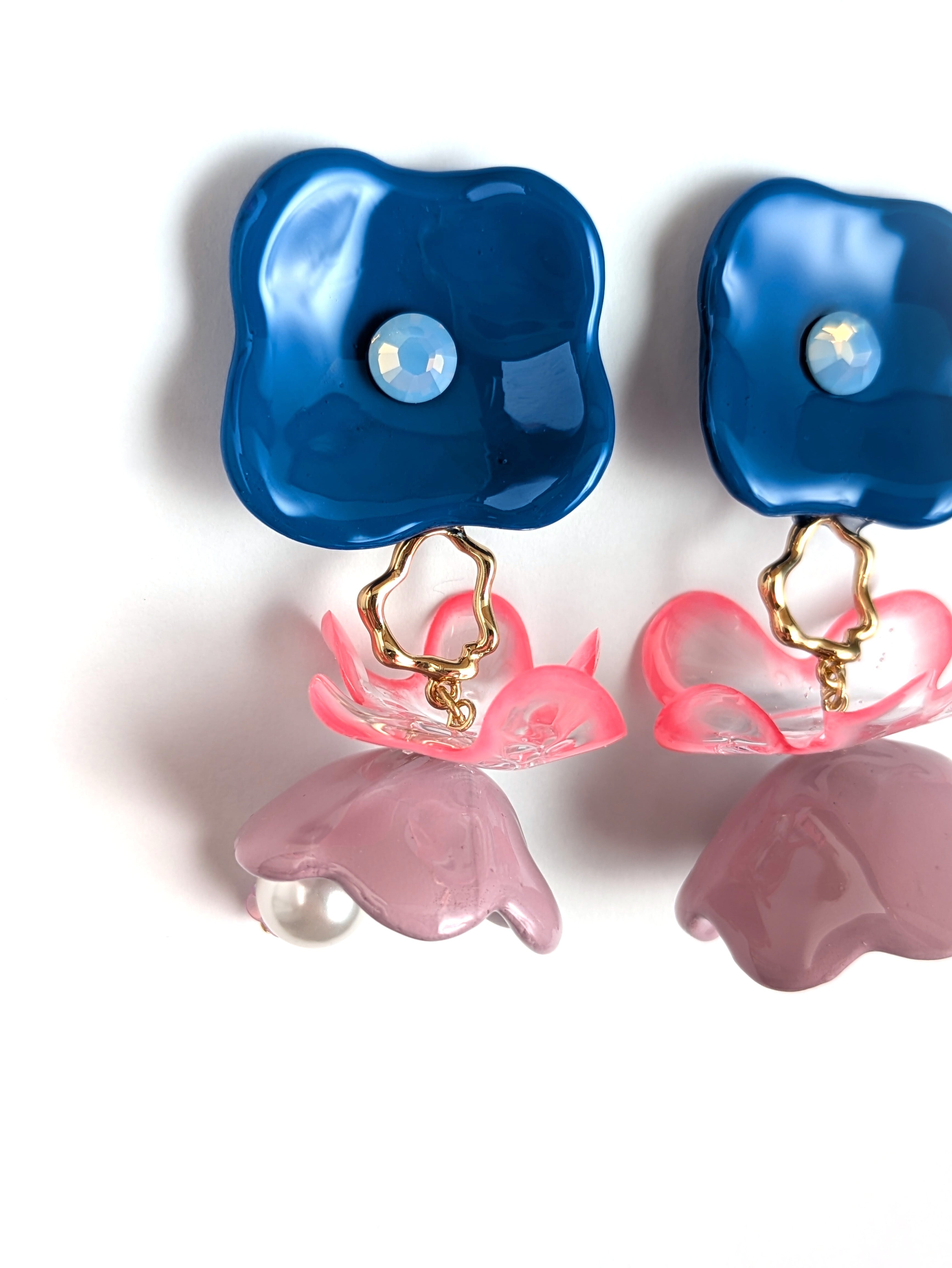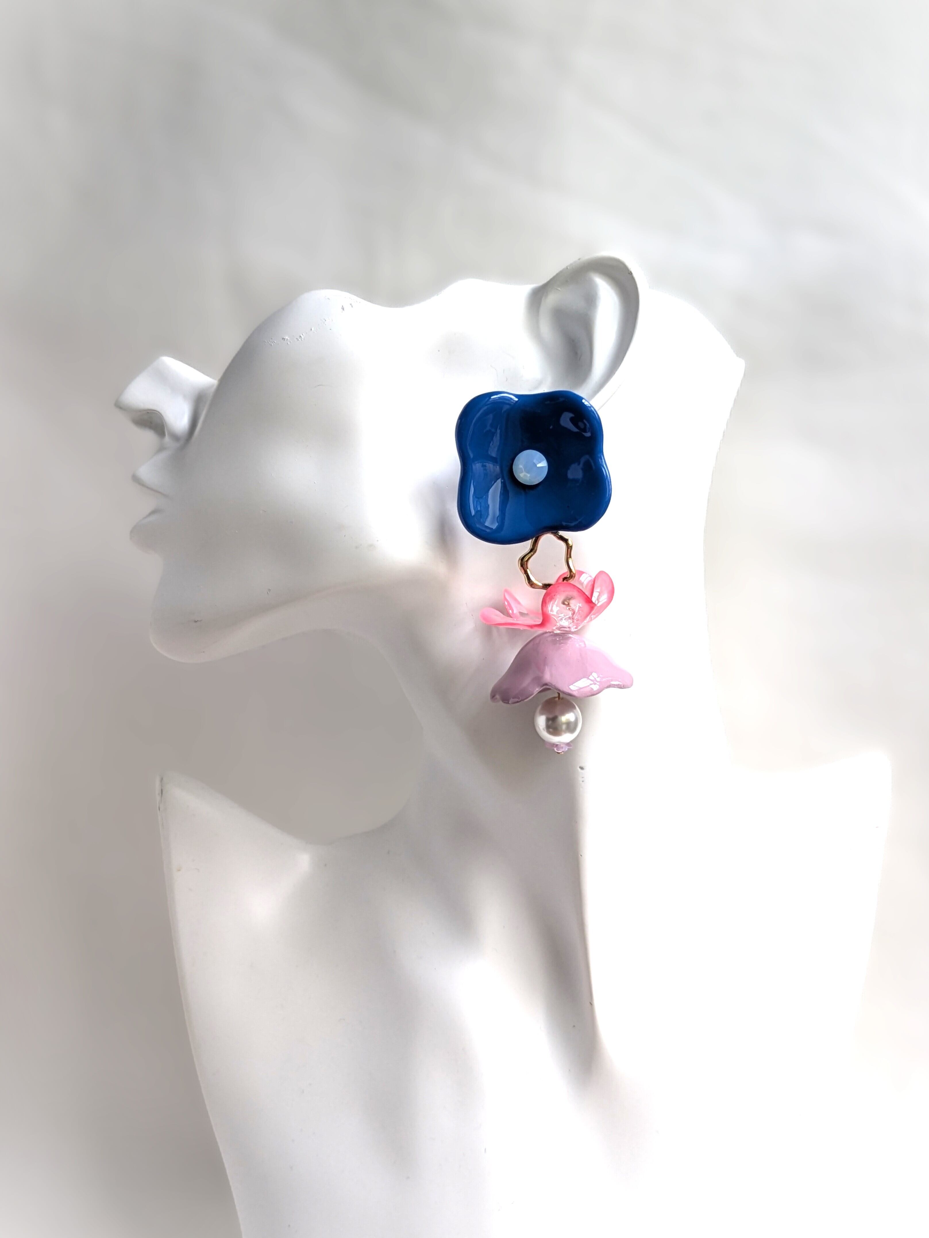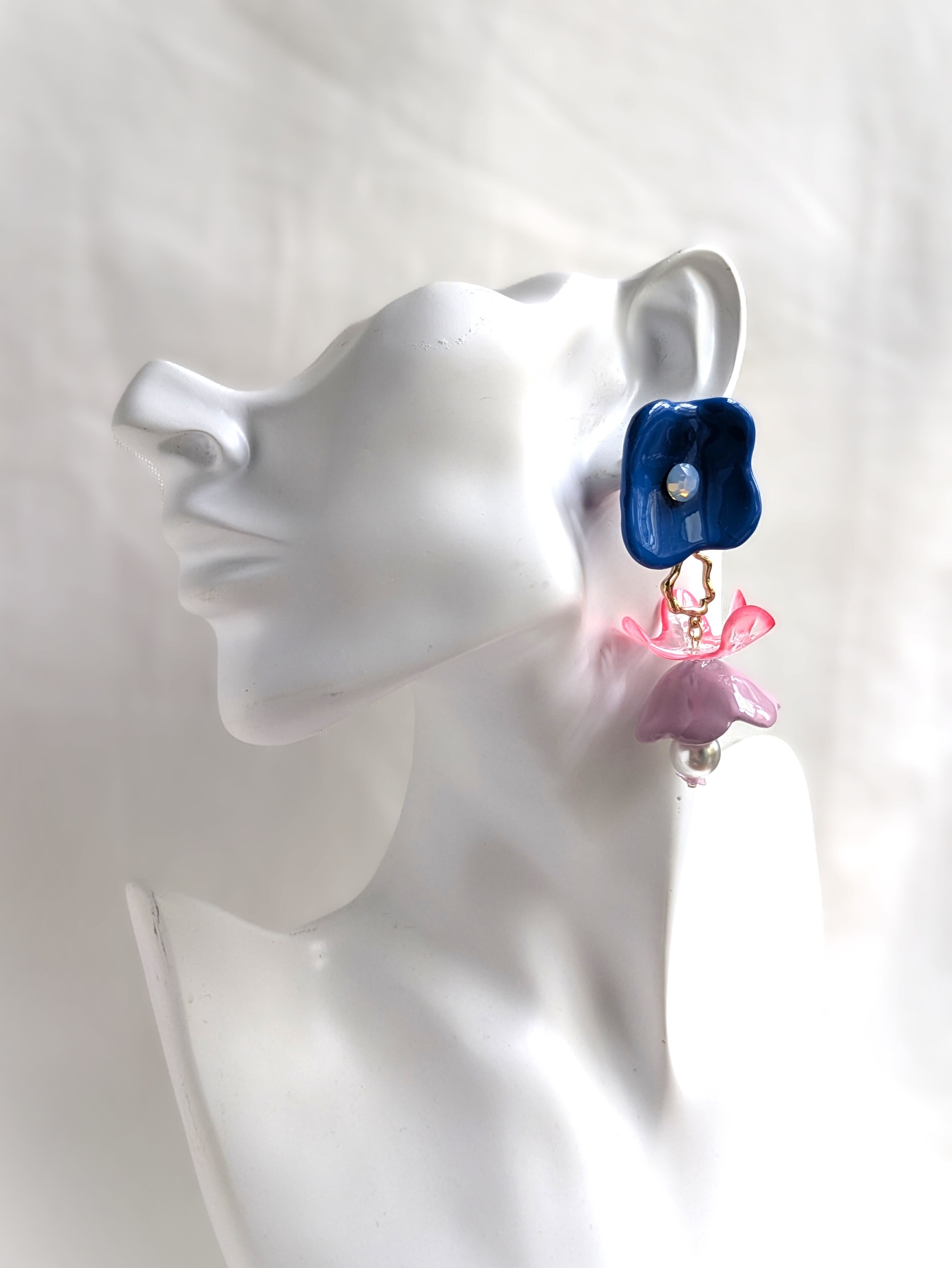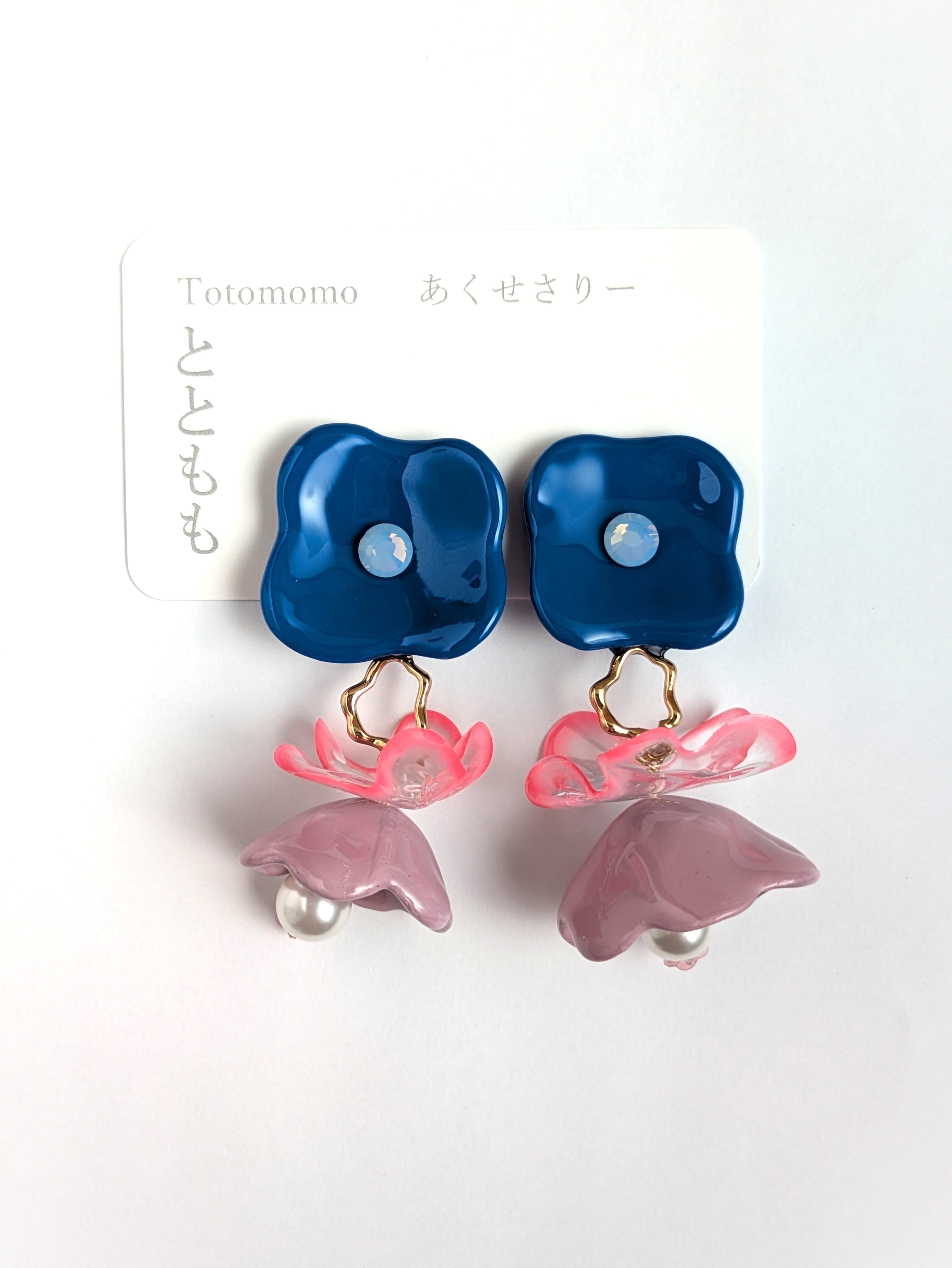 はっきりしたブルーの花が特徴的な耳飾りです。真ん中にミルキーなガラスパーツを配置して、シンプルな可愛さを引き出しました。2種類のピンクの花が組み合わさったパーツがゆらゆらと揺れる様子がかわいらしいです!また、軽やかな素材のため、長時間の装着でも快適にお楽しみいただけます。