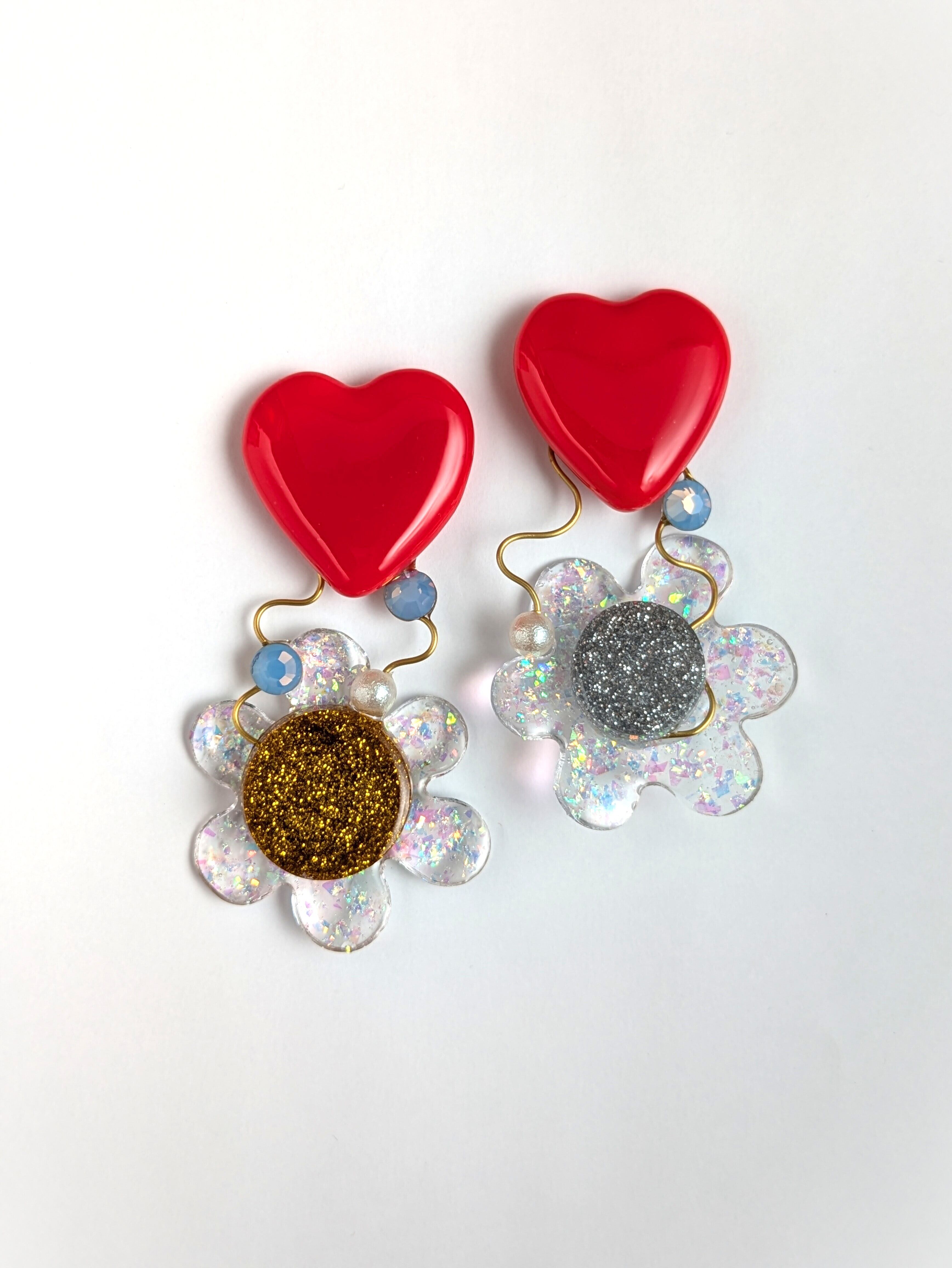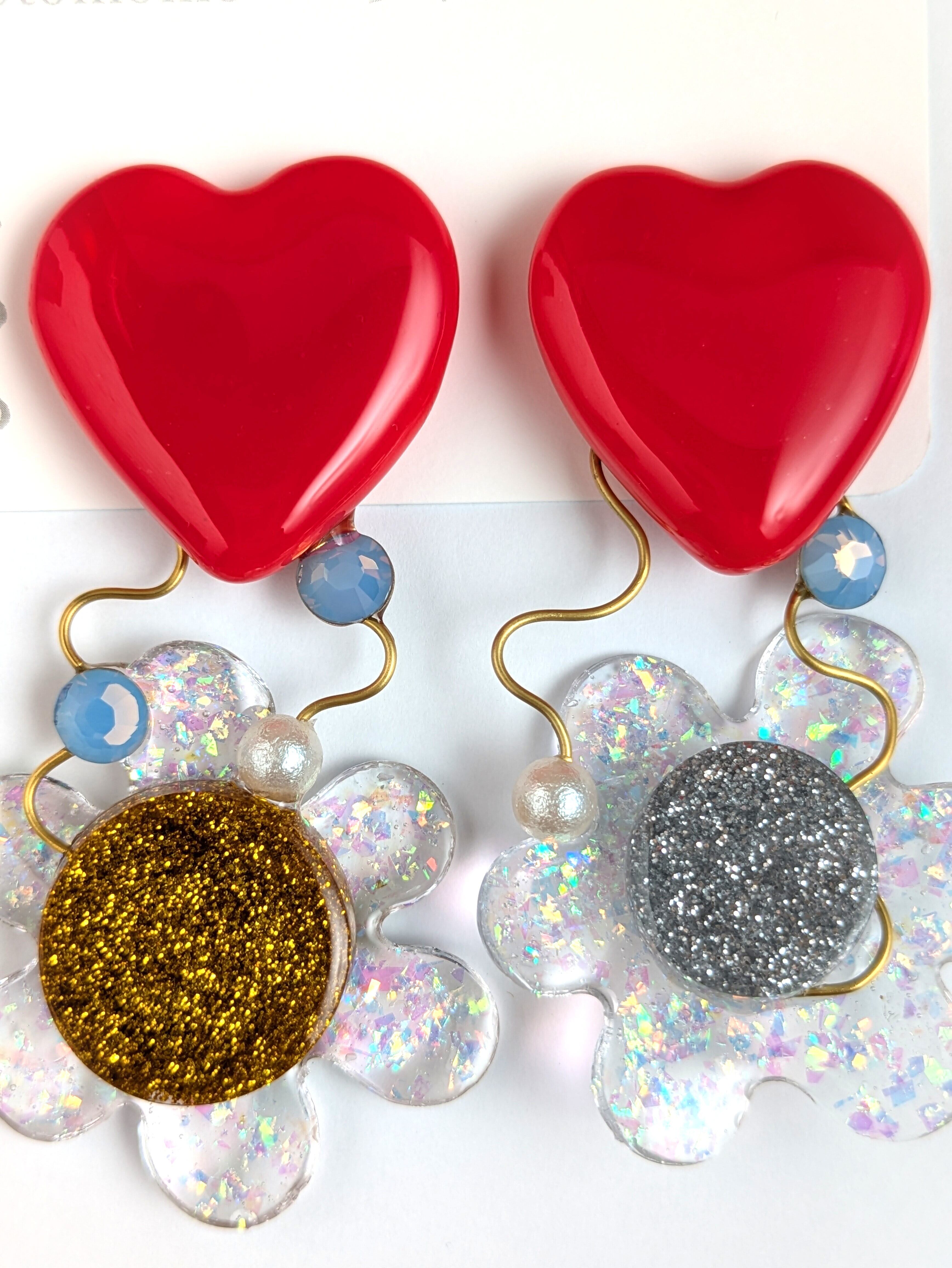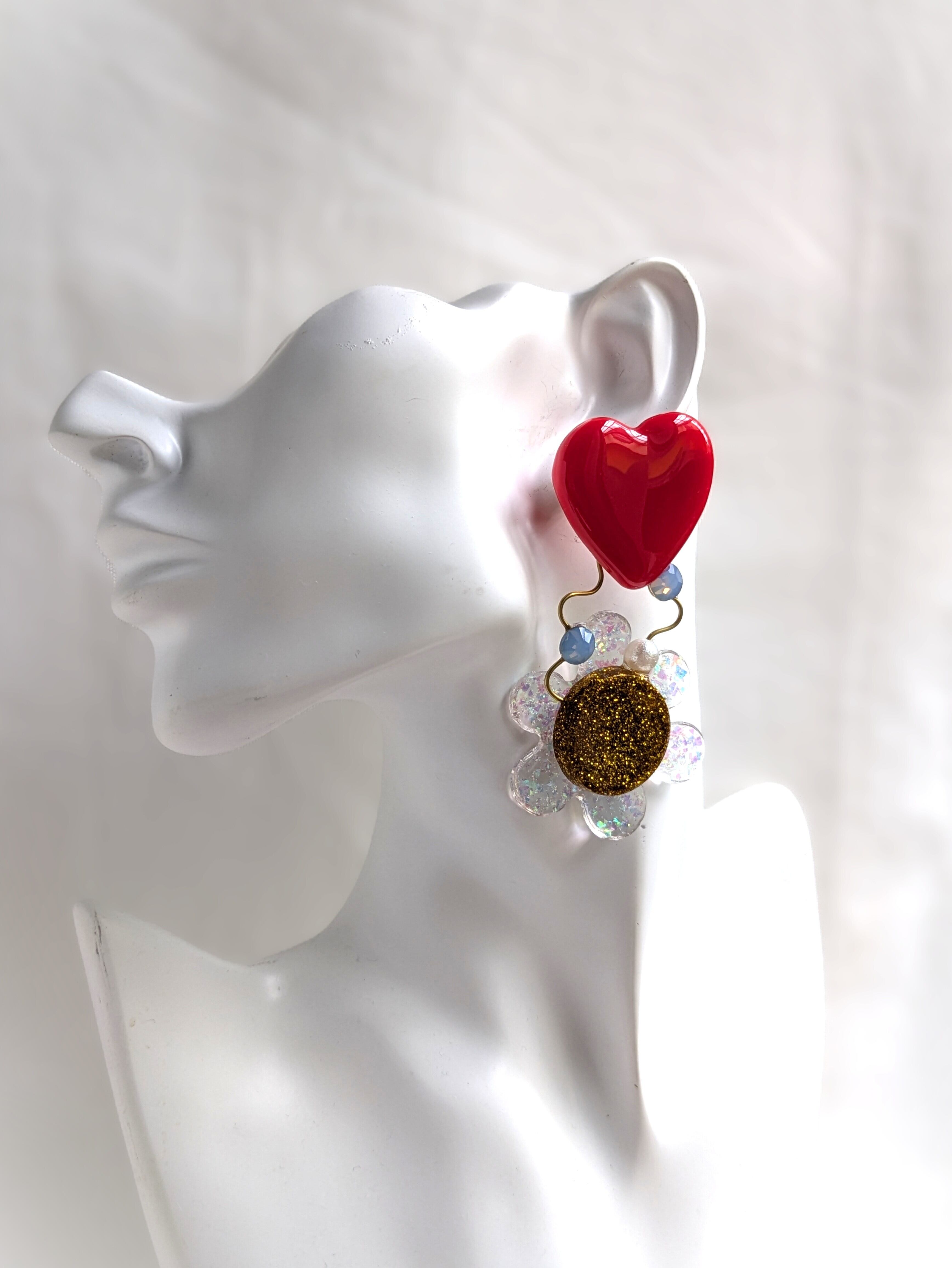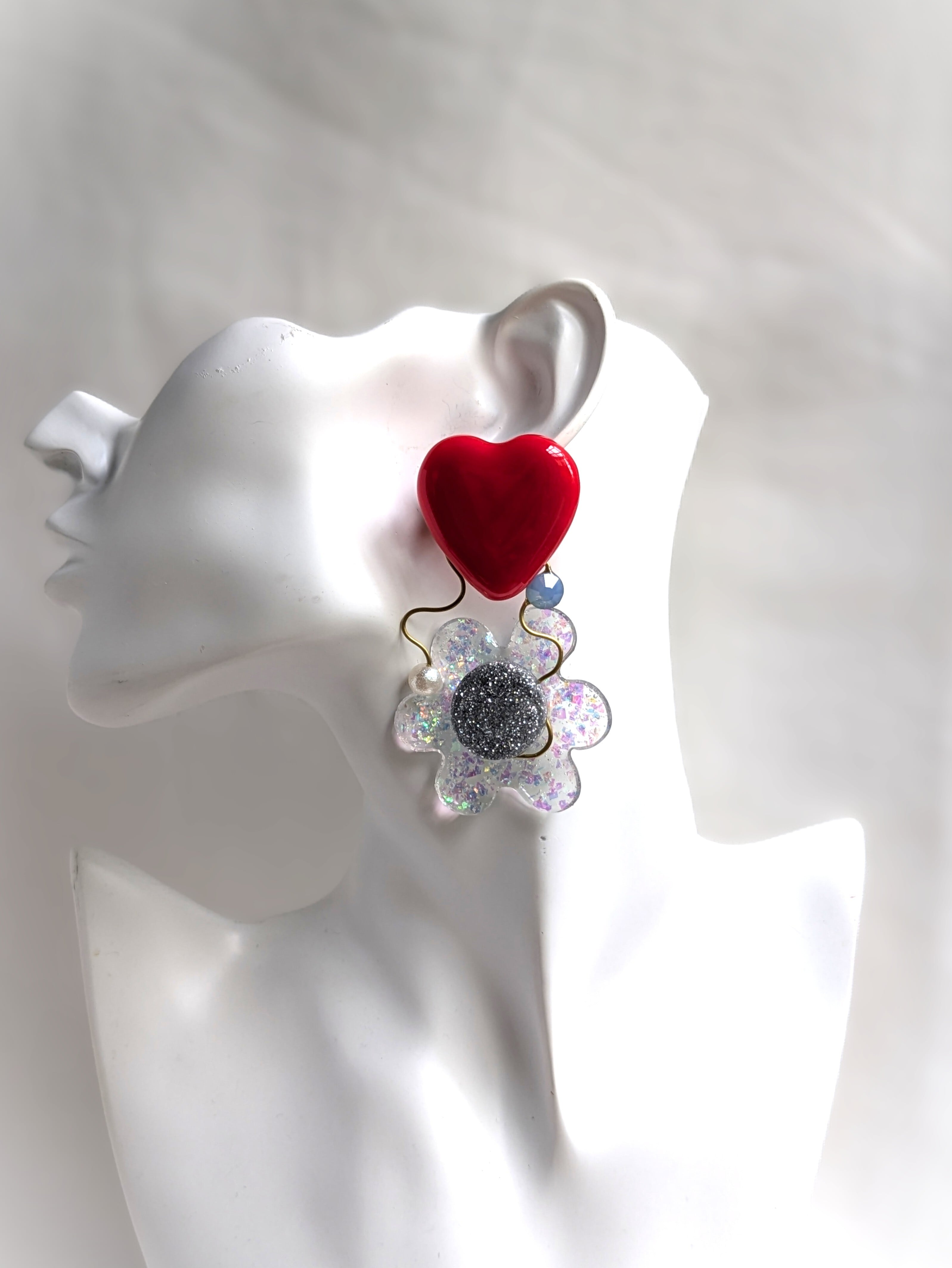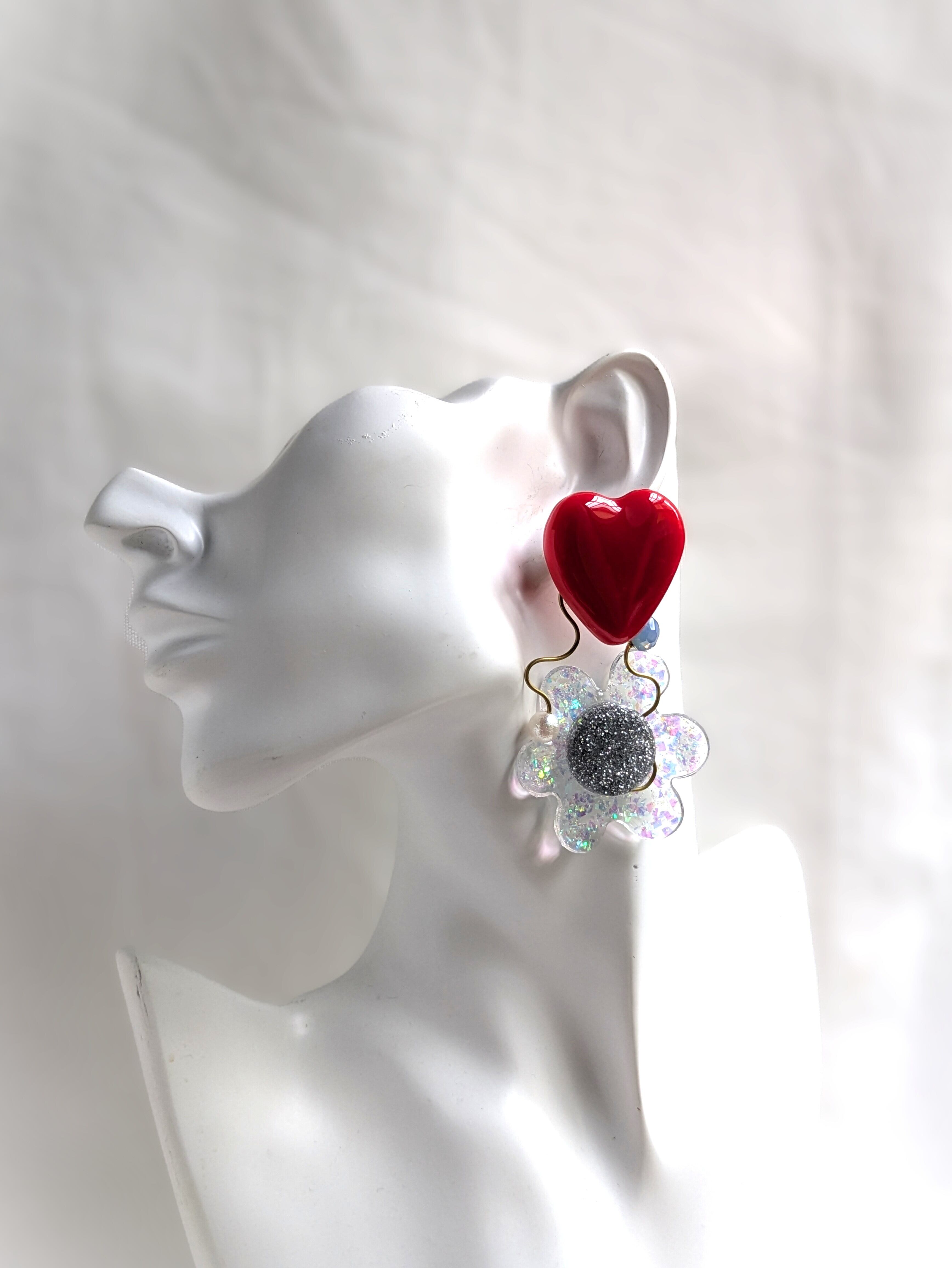 These earrings feature a striking bright red heart. They've been crafted into sparkling, unique pieces.