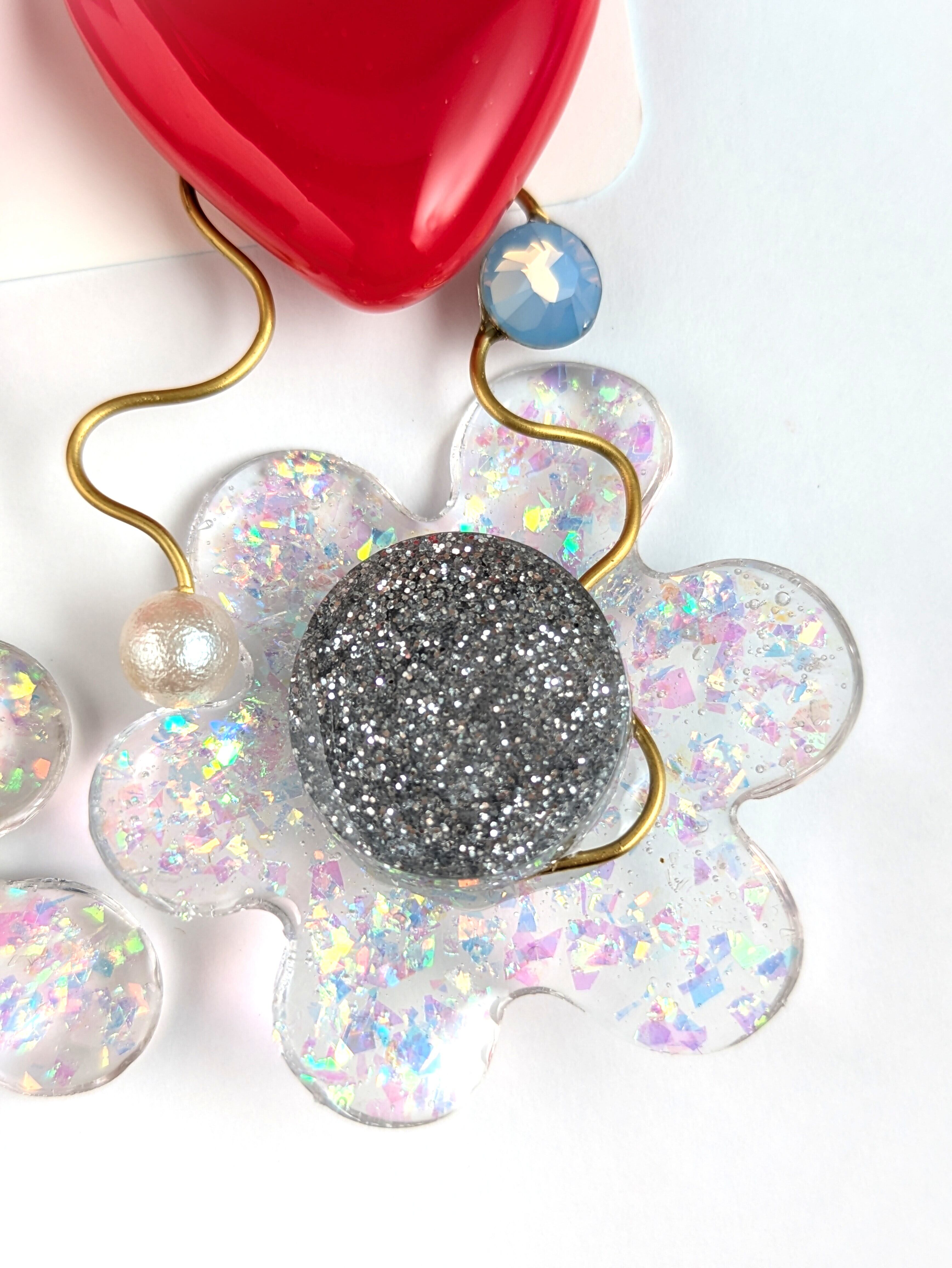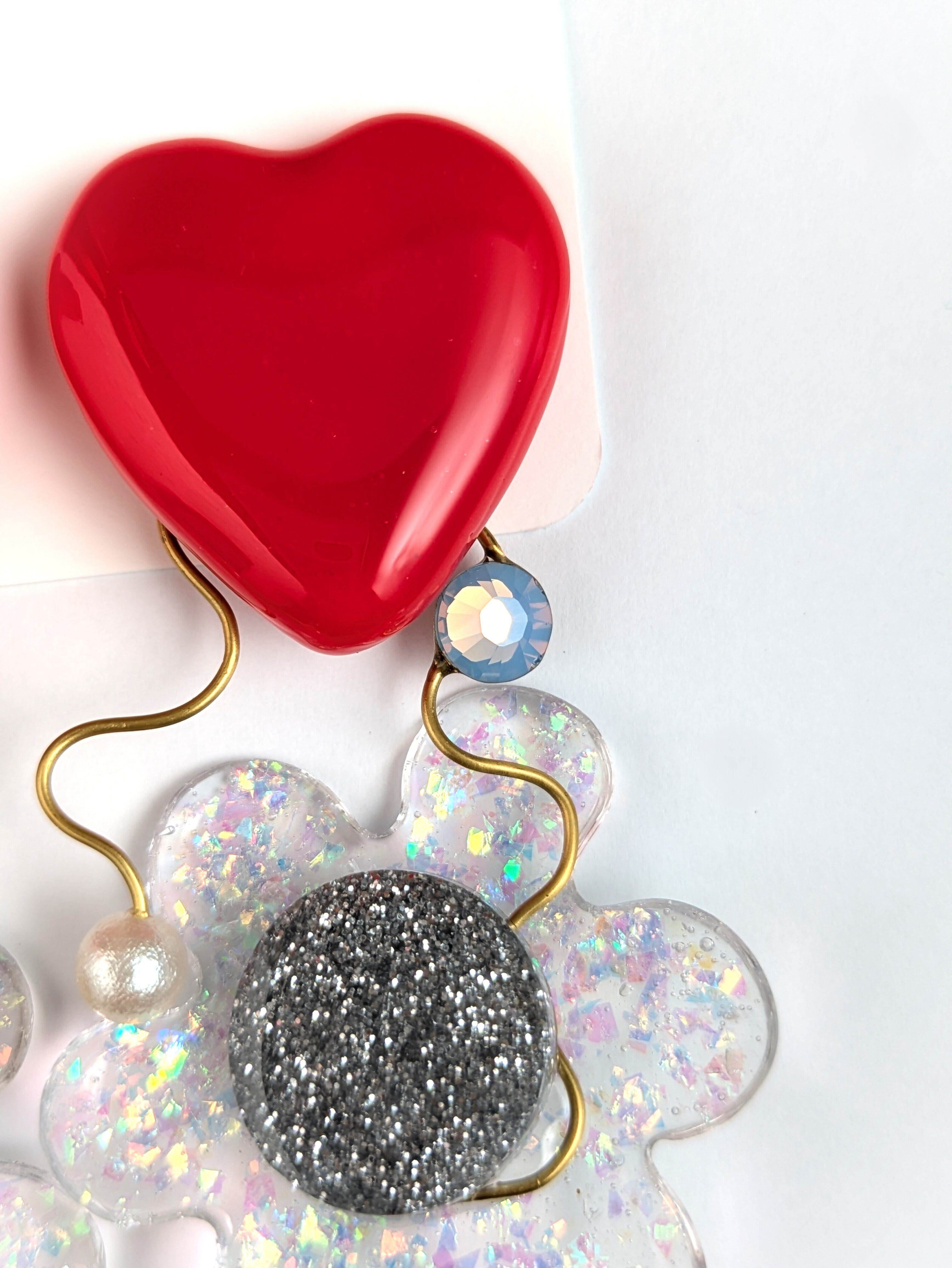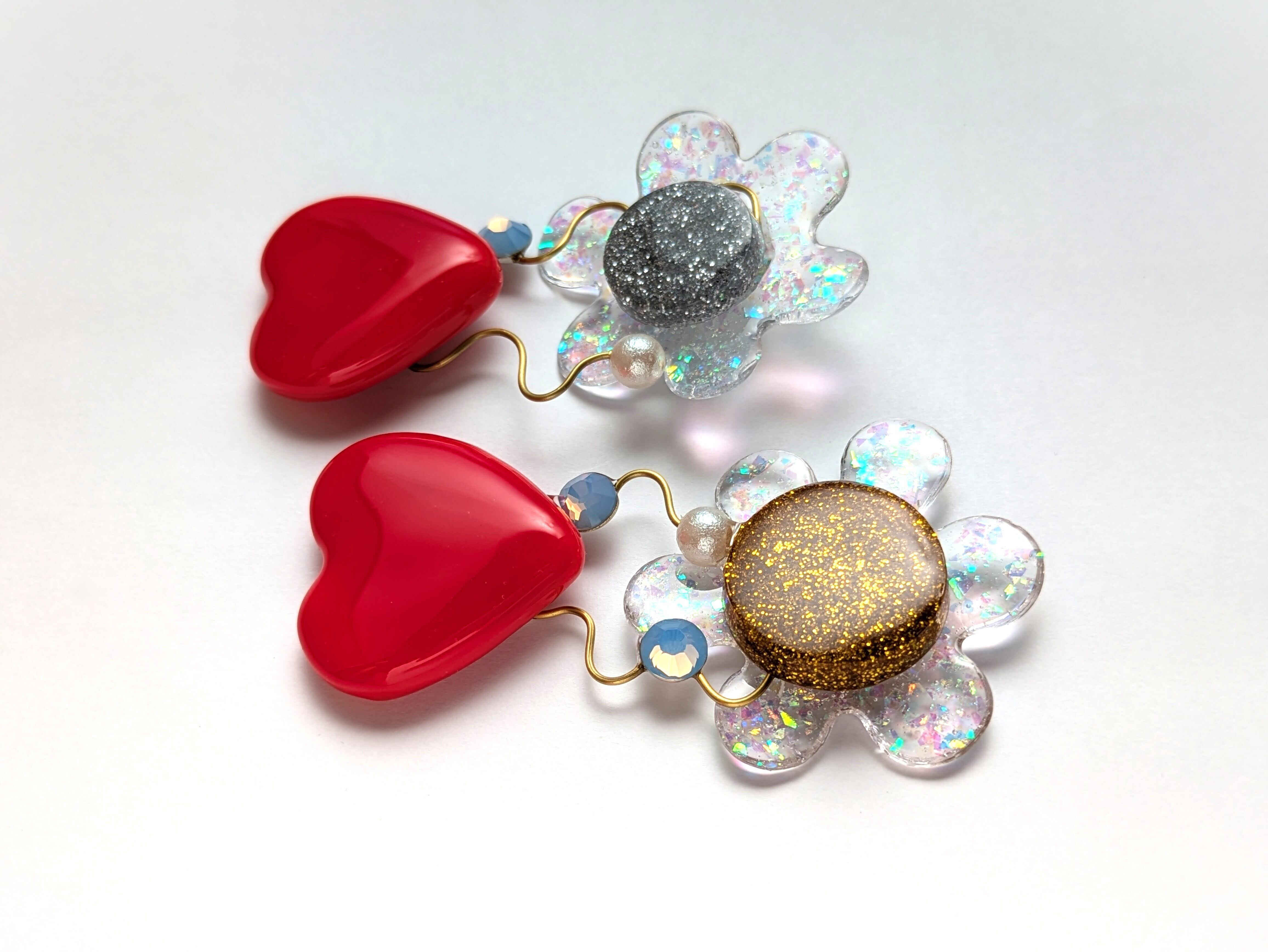 鮮やかな赤いハートが印象的な耳飾りです。キラキラで個性的な耳飾りに仕上がりました。