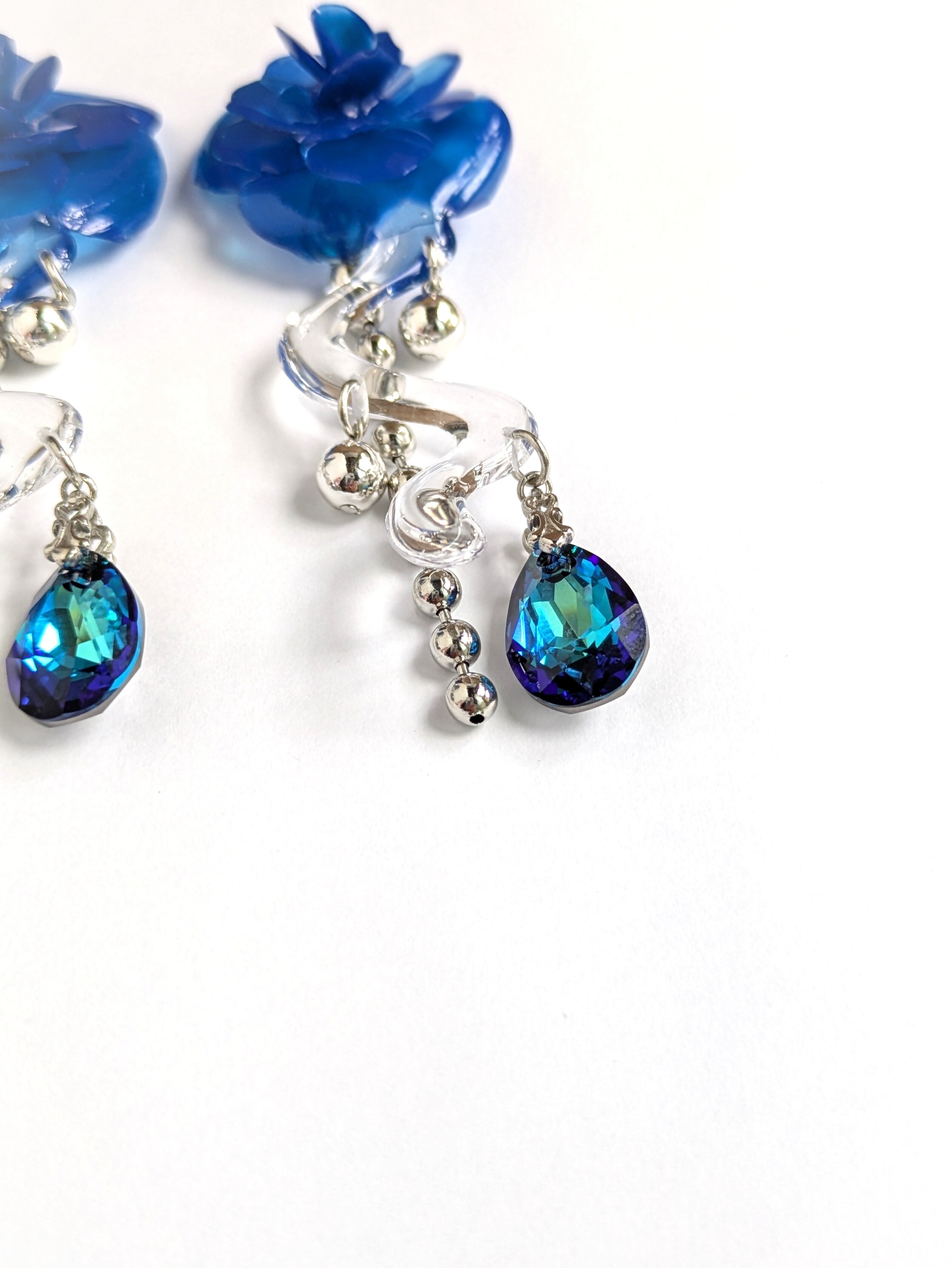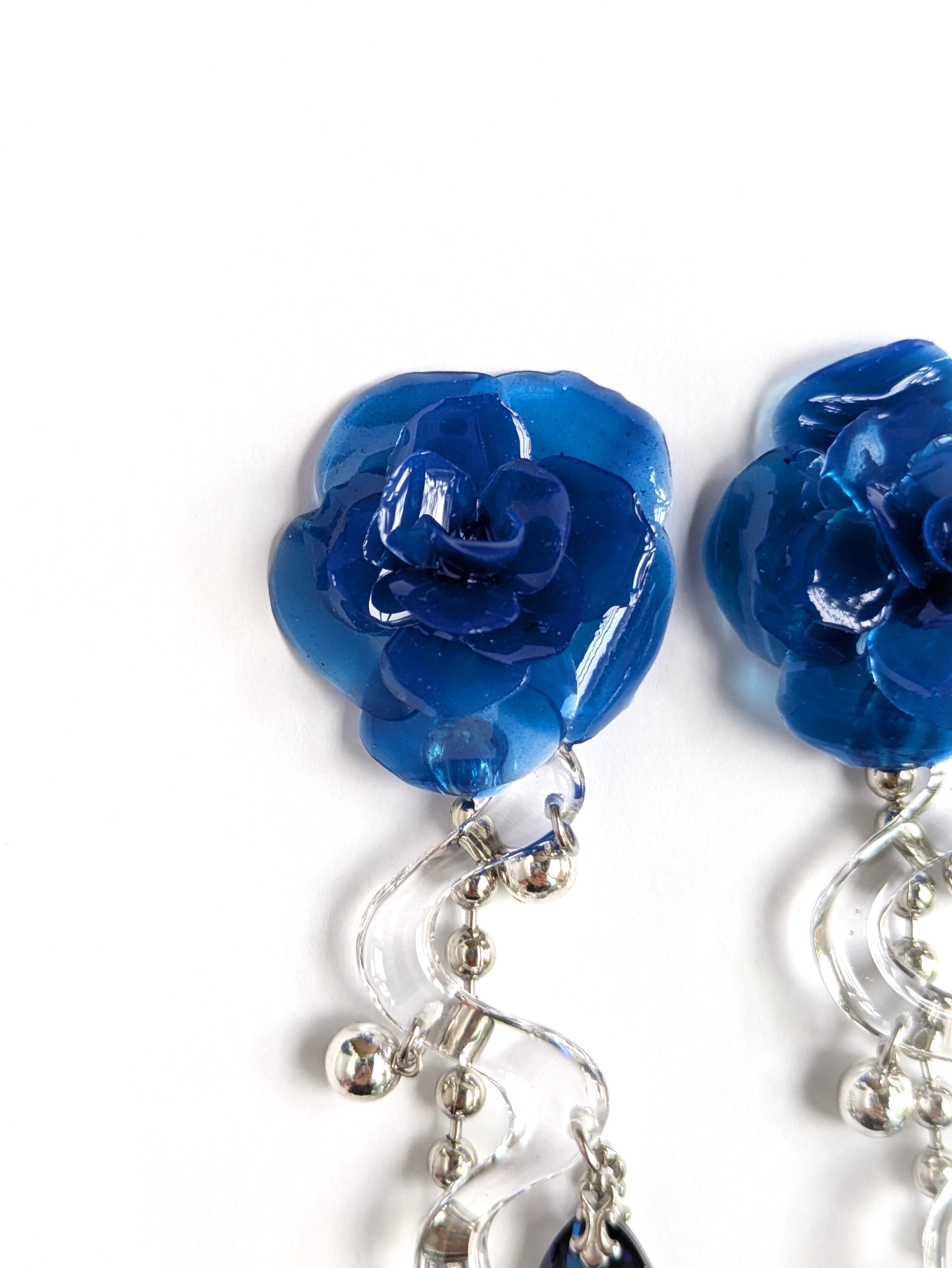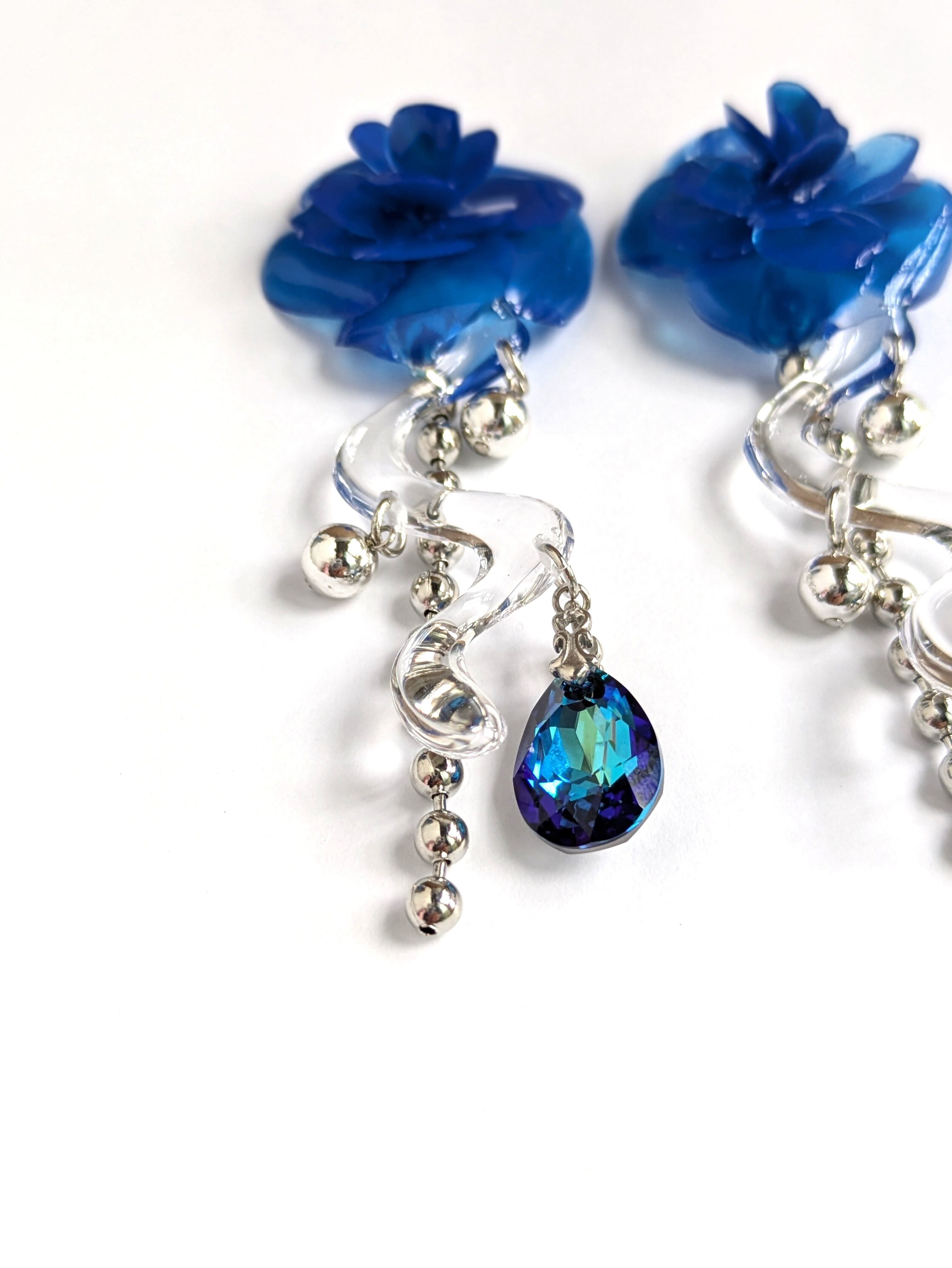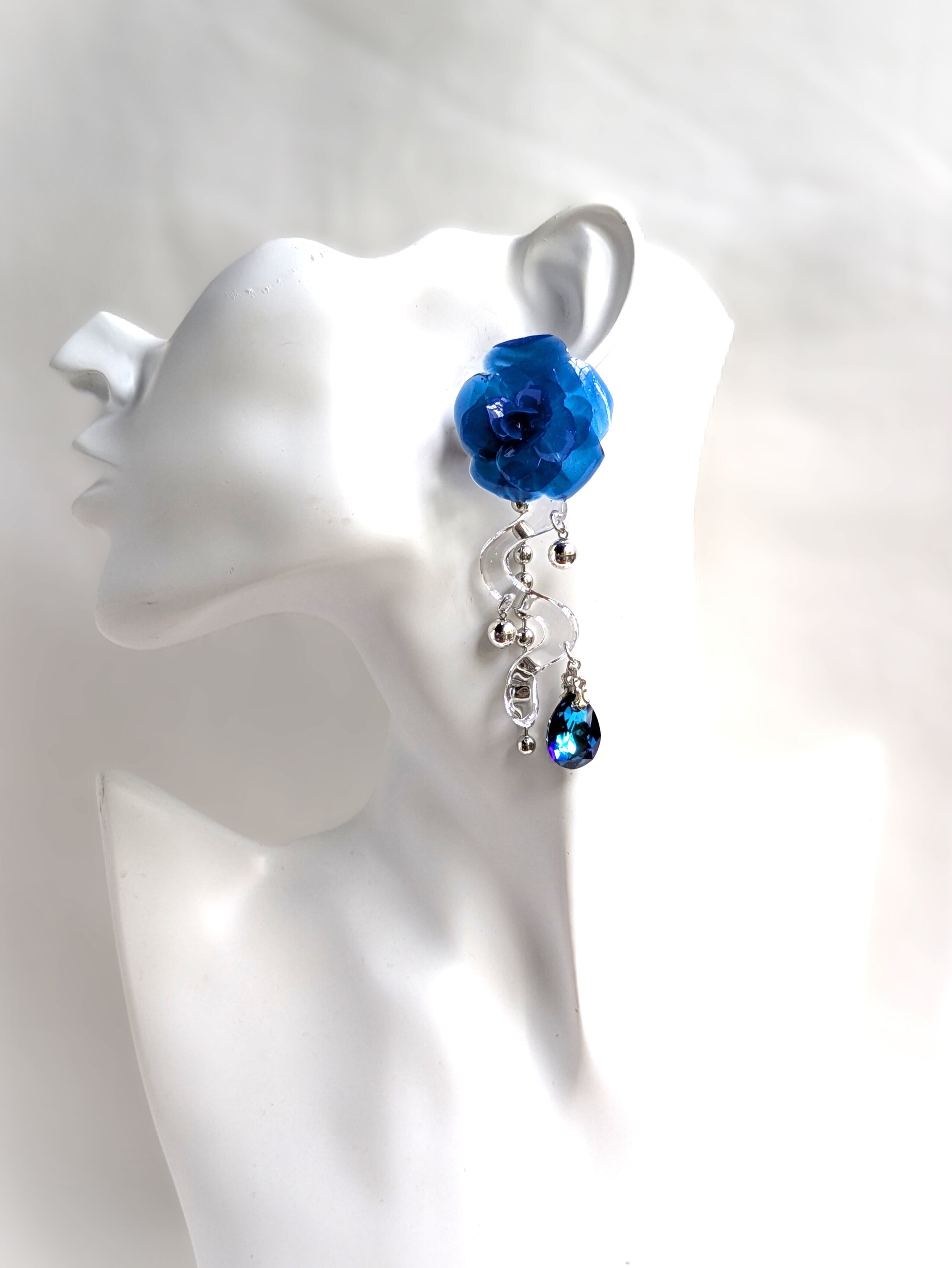 These earrings feature a striking, three-dimensional blue rose.