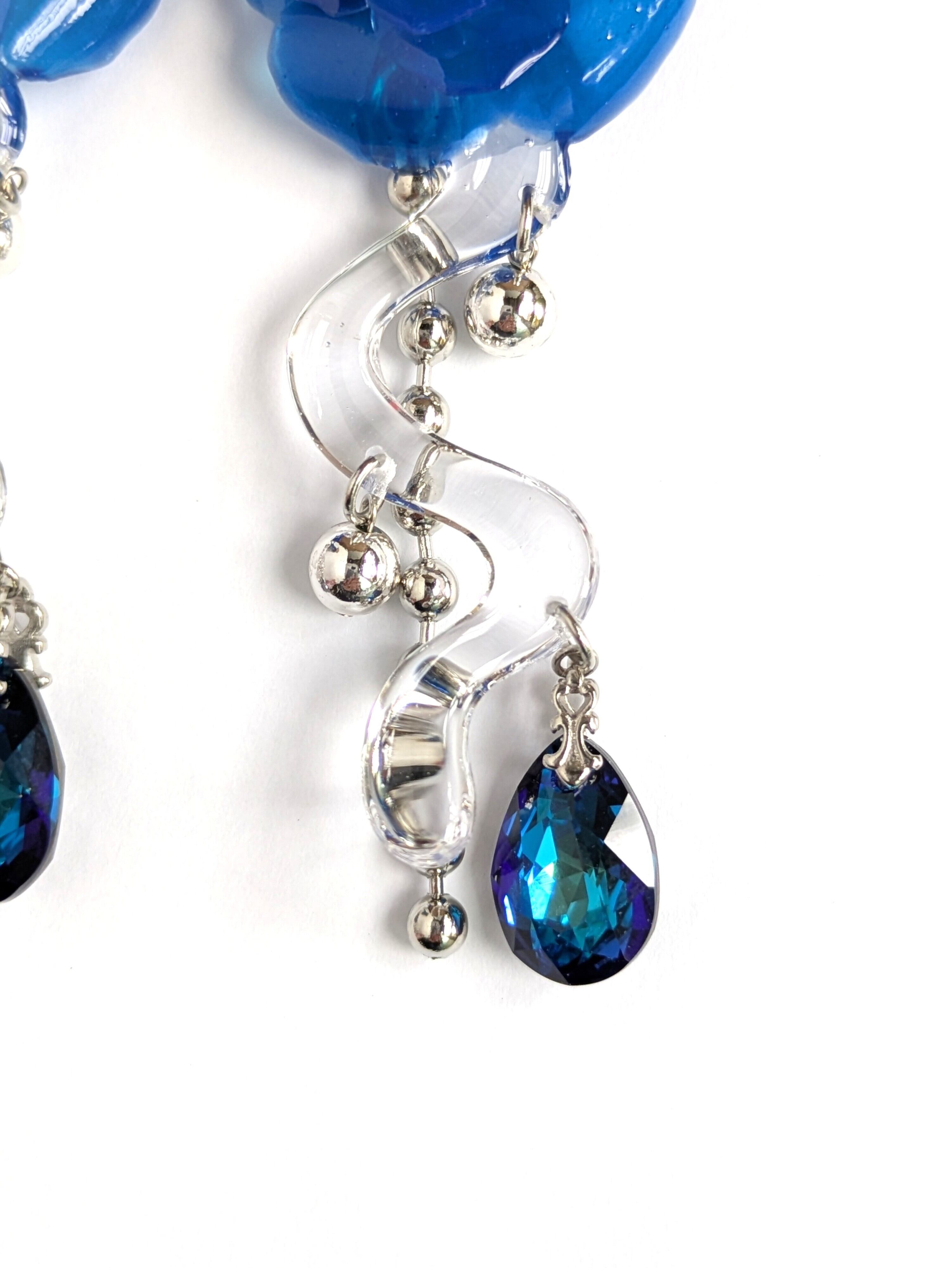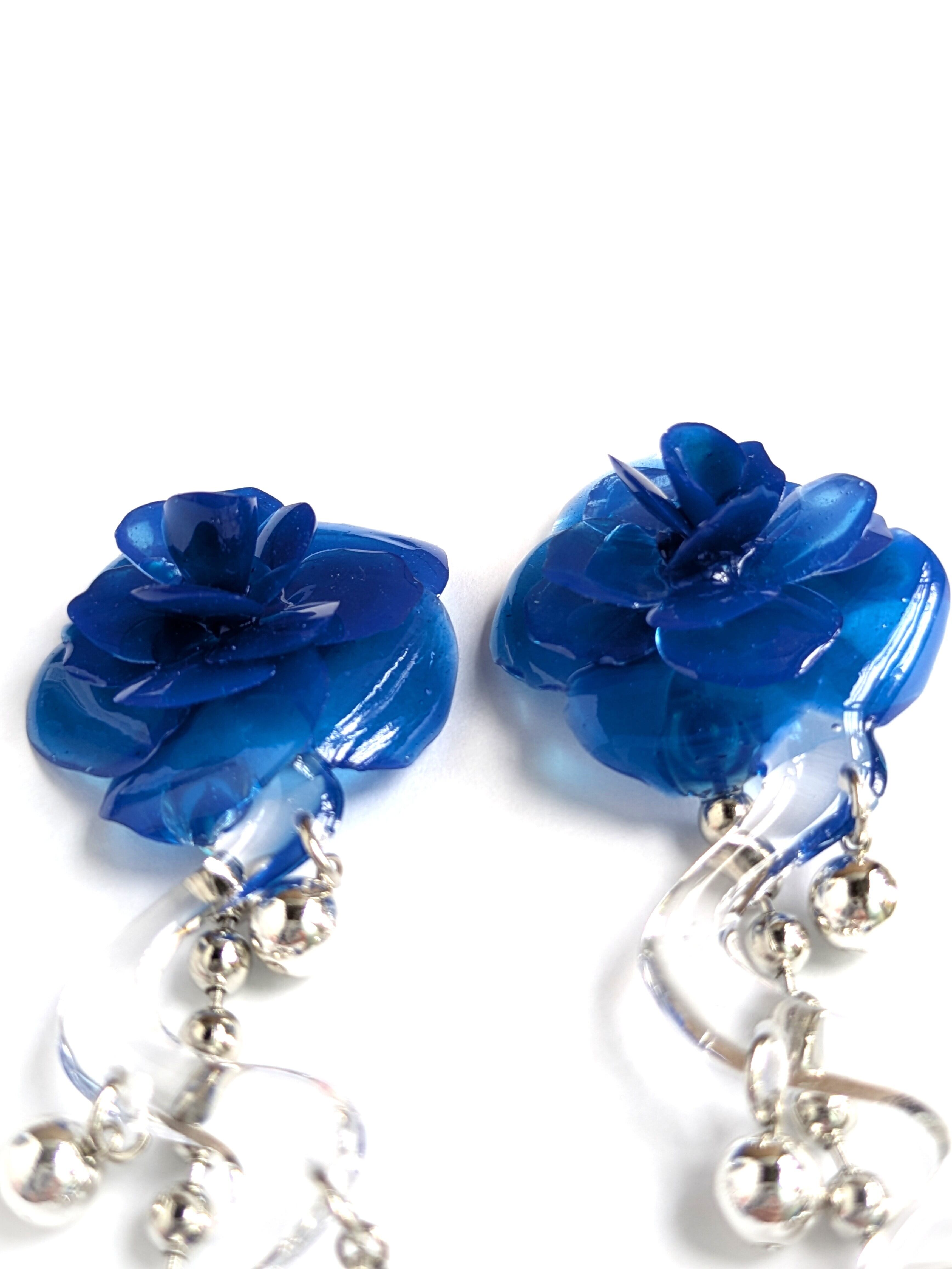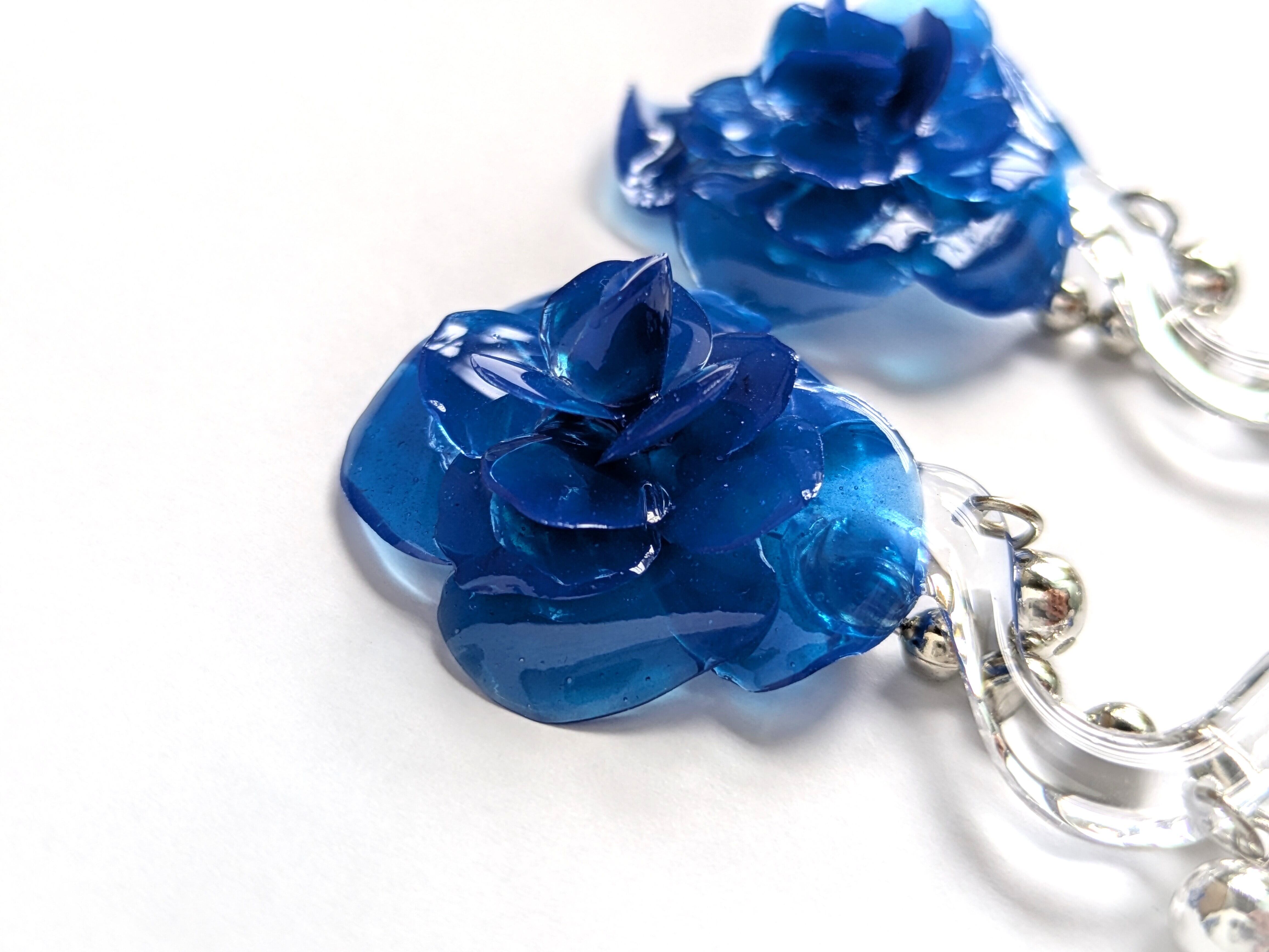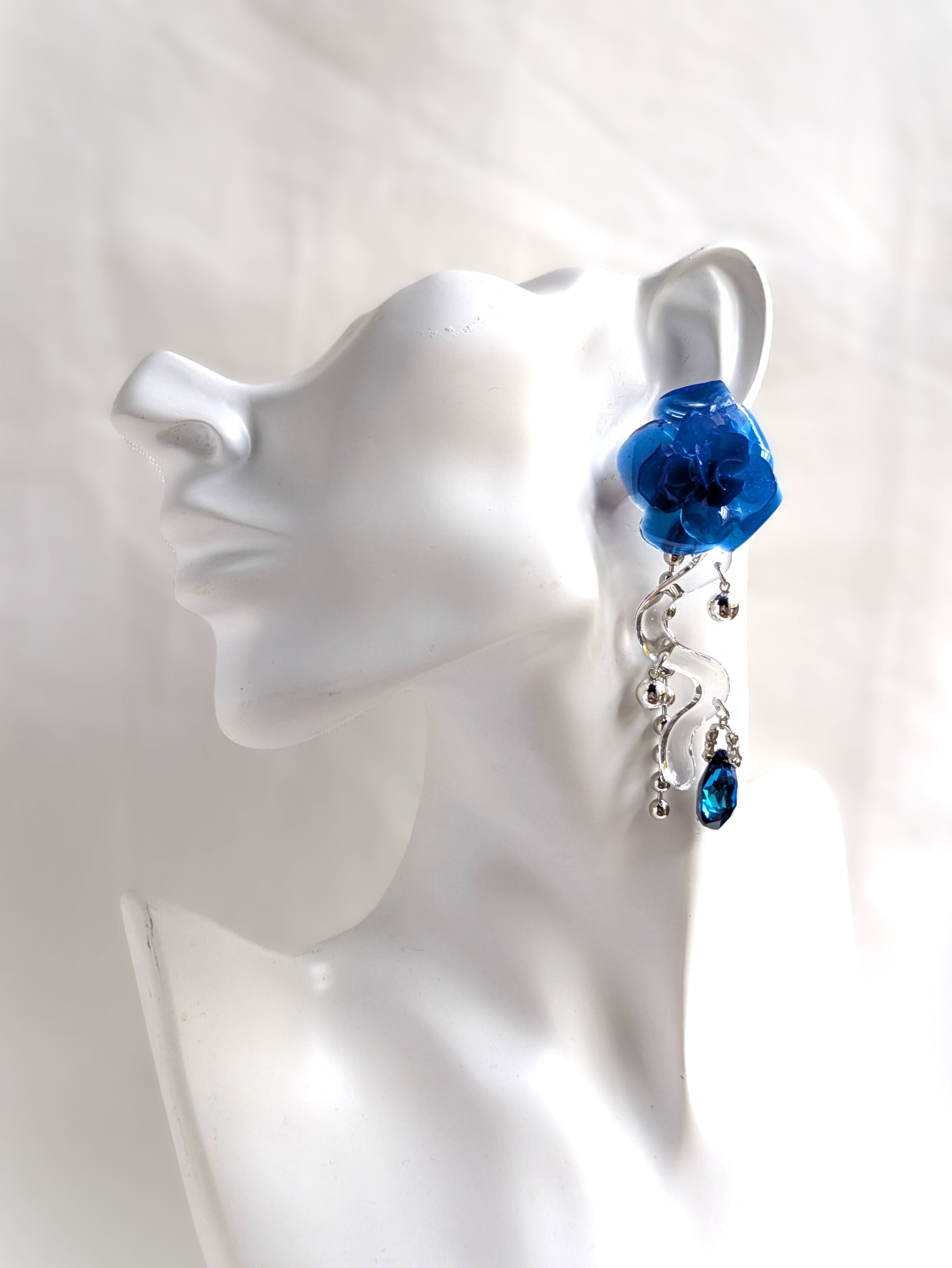 These earrings feature a striking, three-dimensional blue rose.