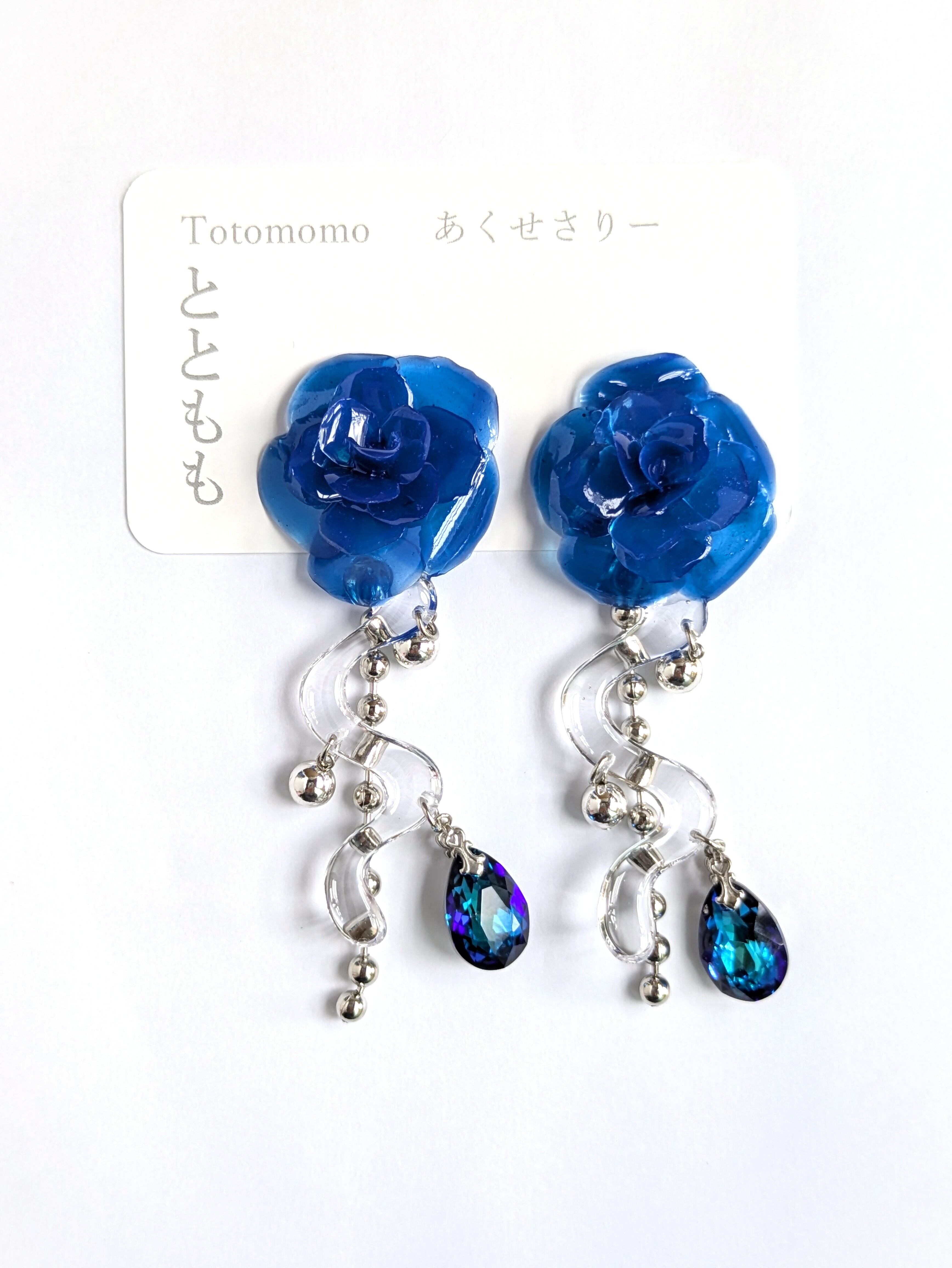華やかで立体的な青い薔薇が印象的な耳飾りです。