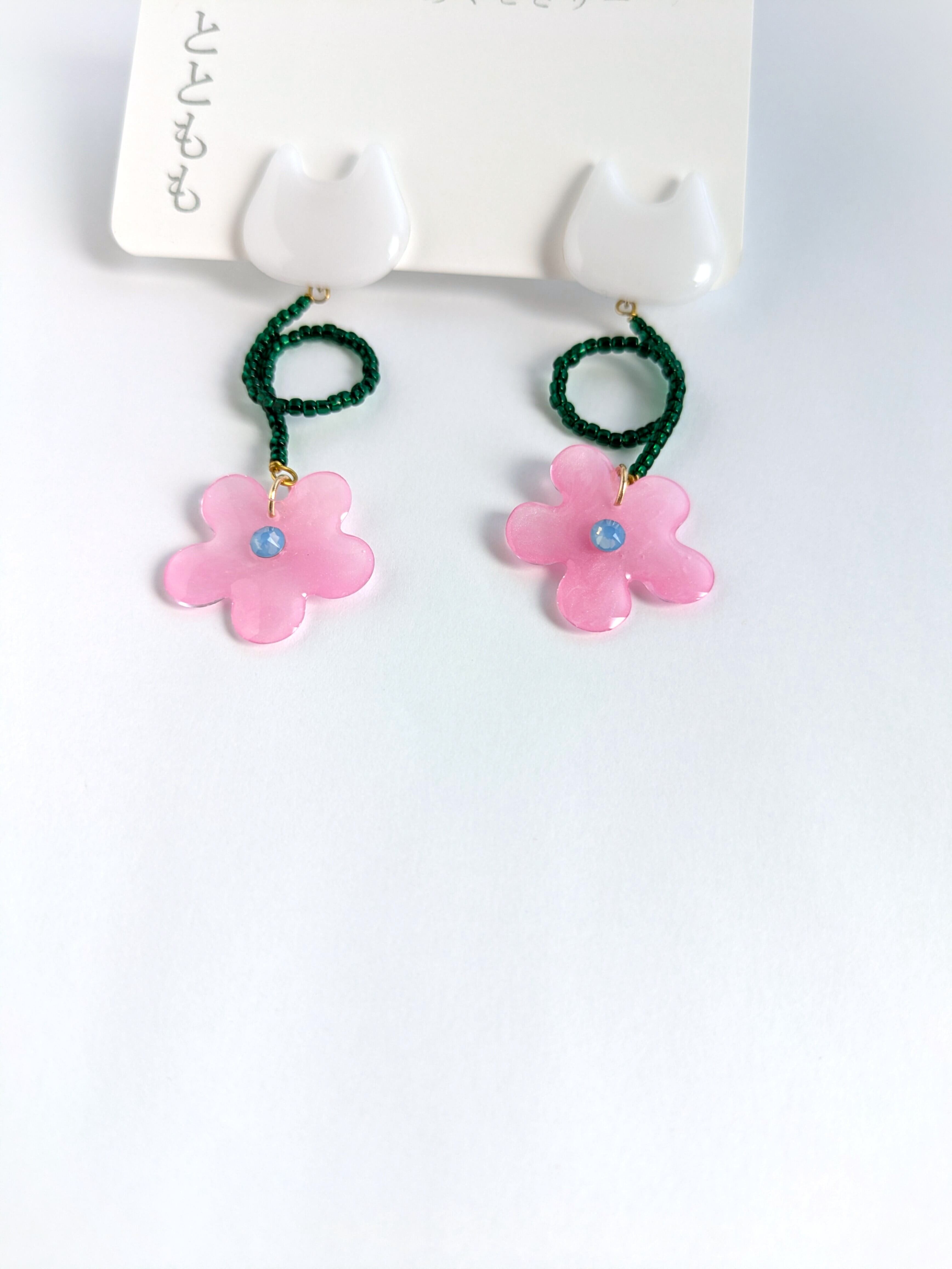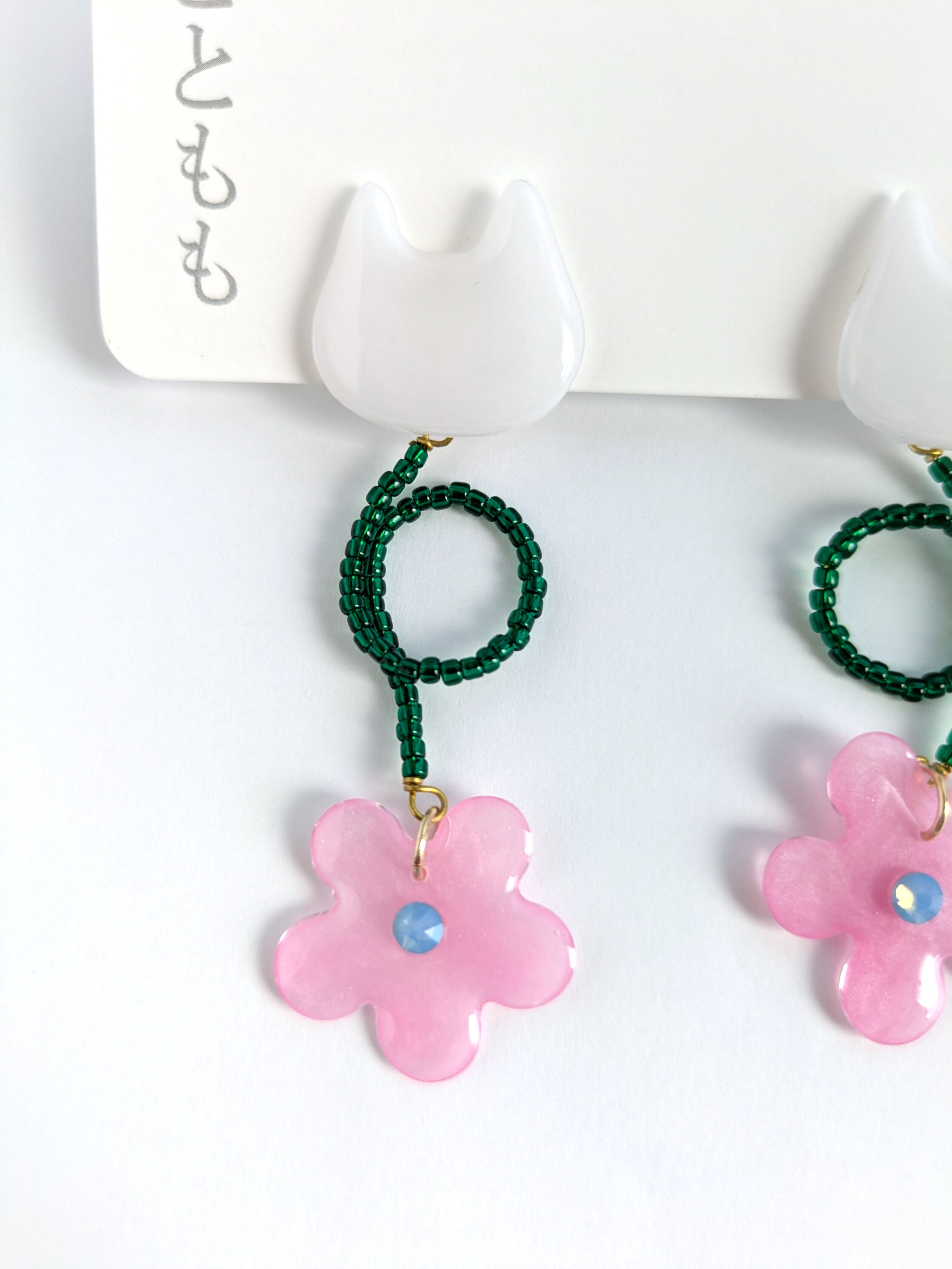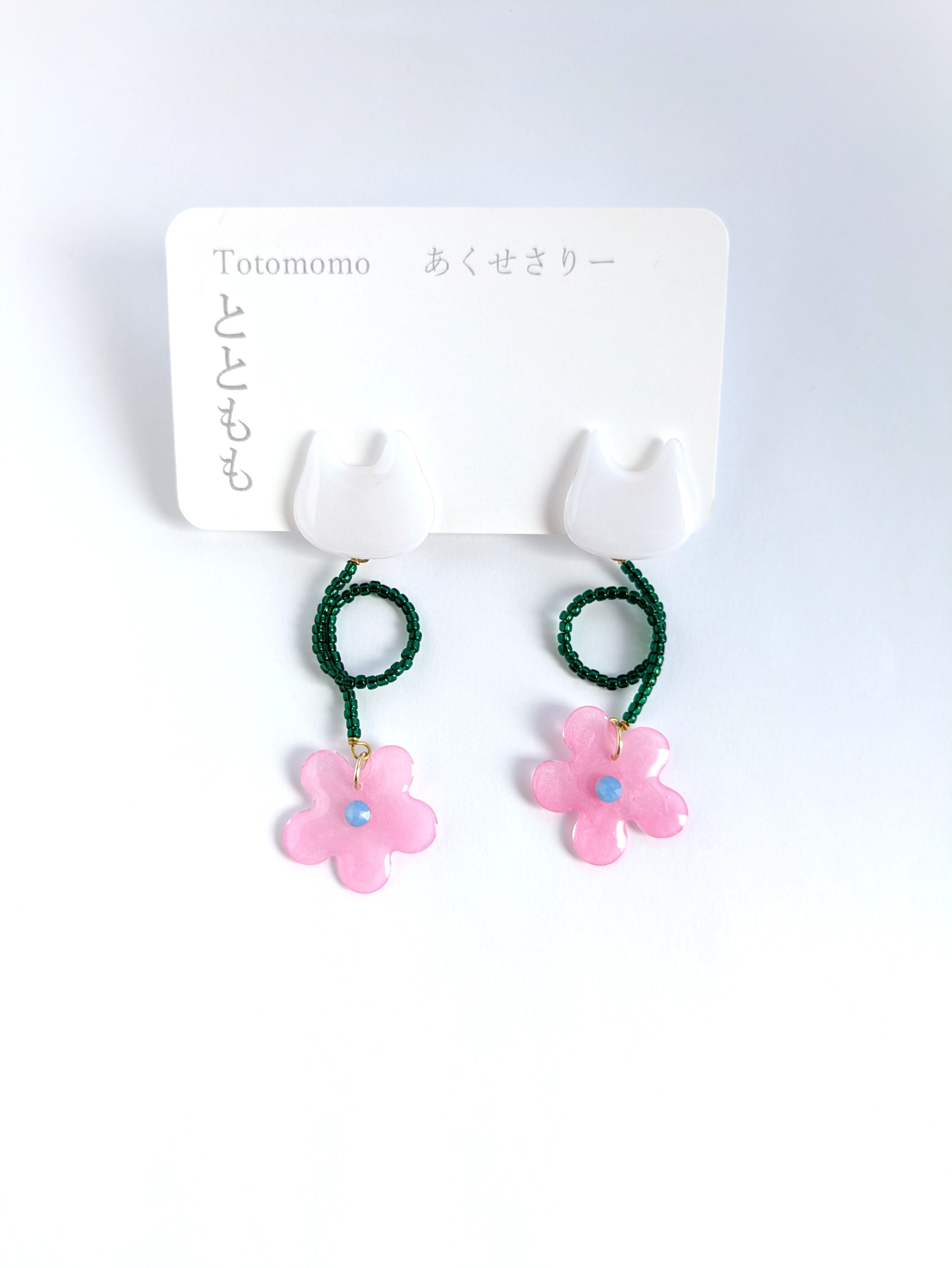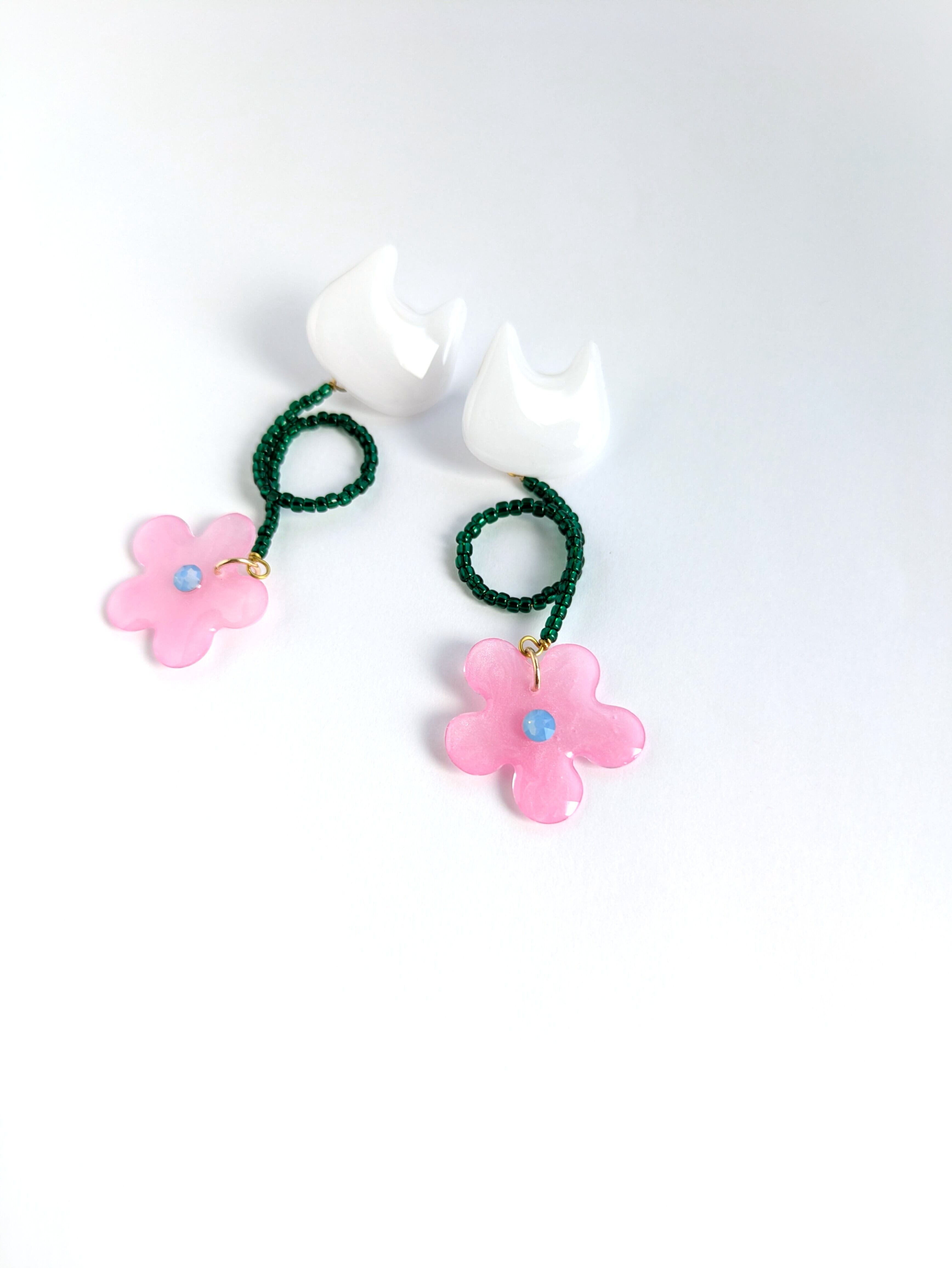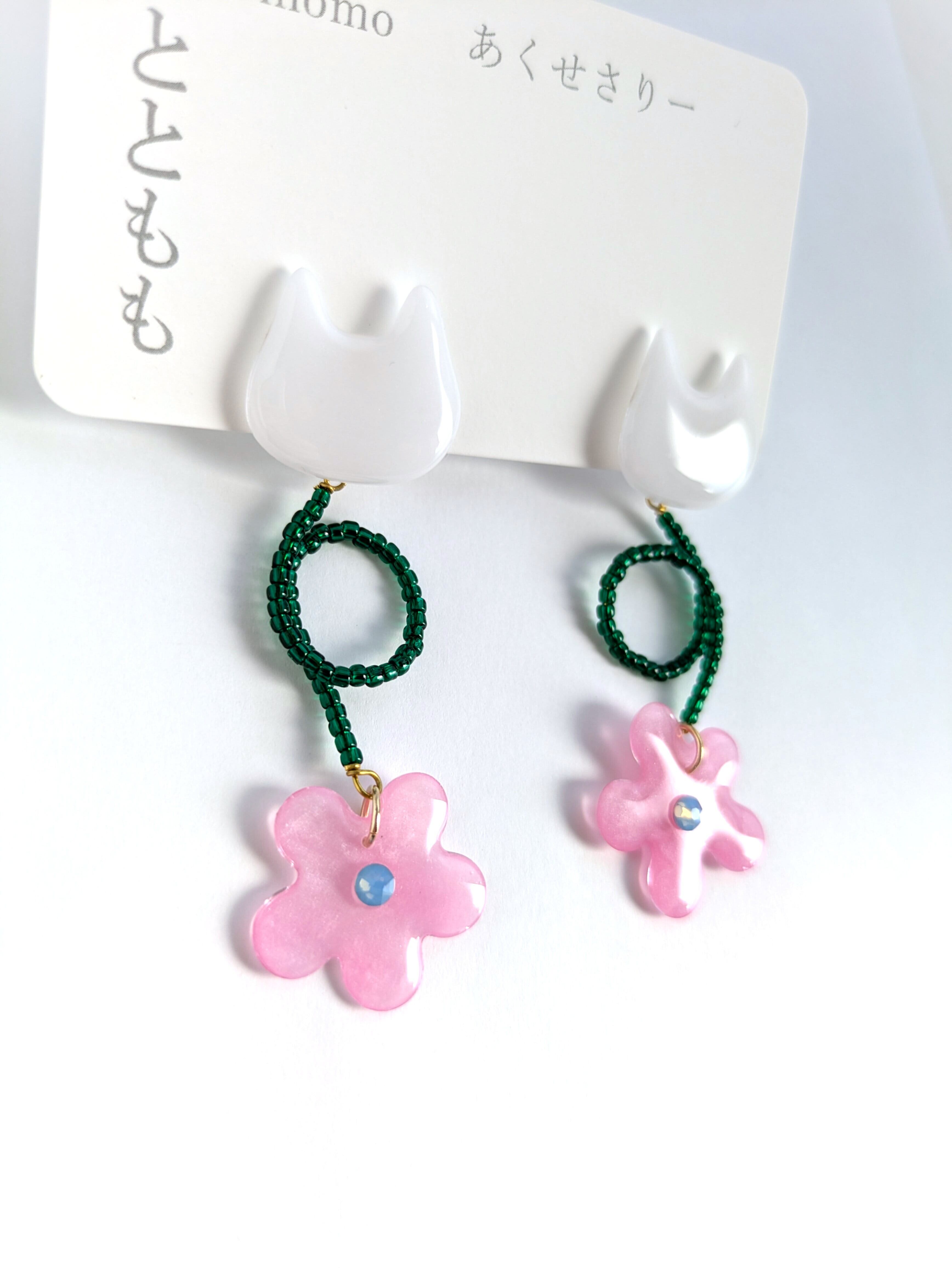 白いねことお花の耳飾り//White Cat and Flowers