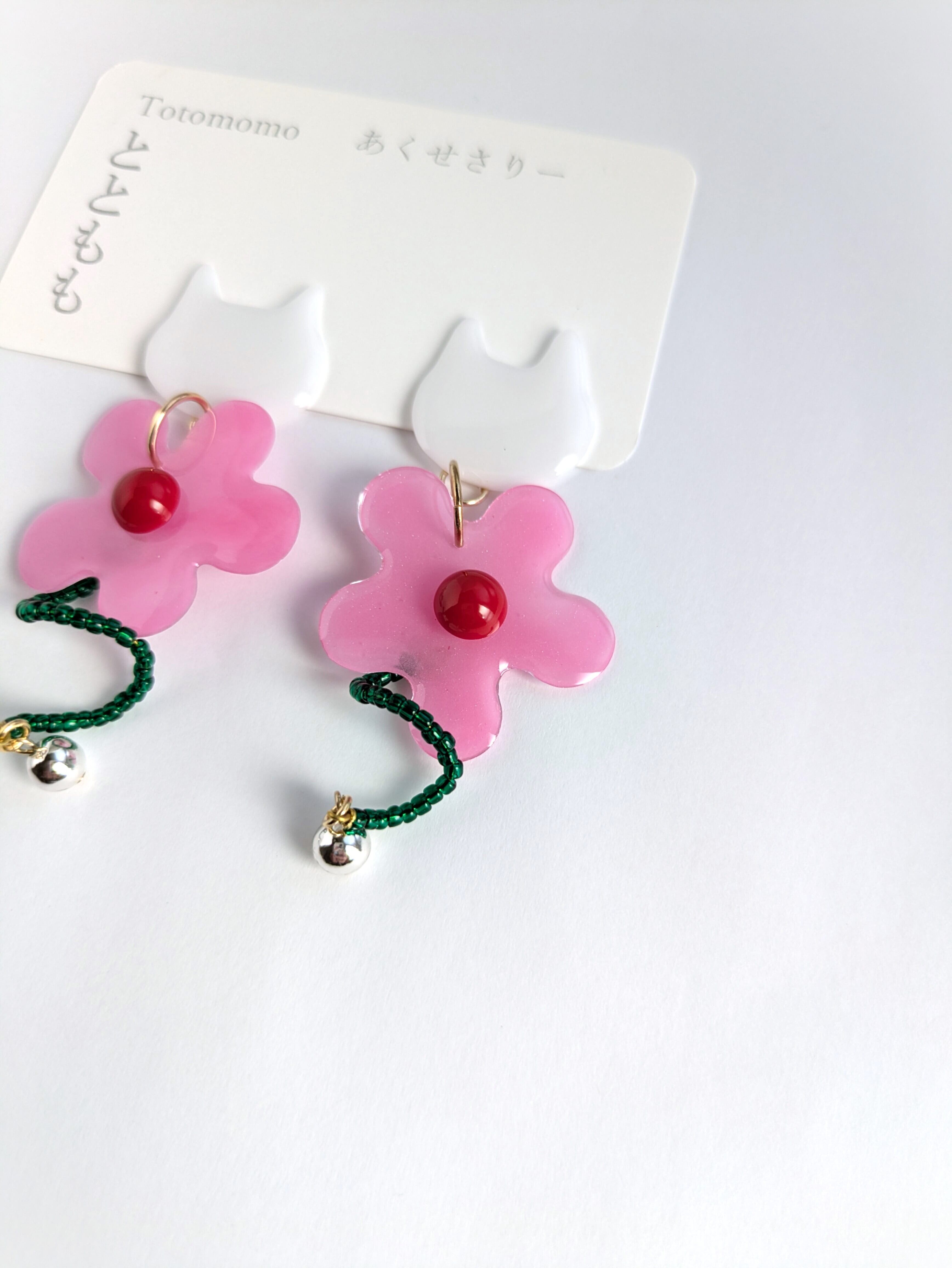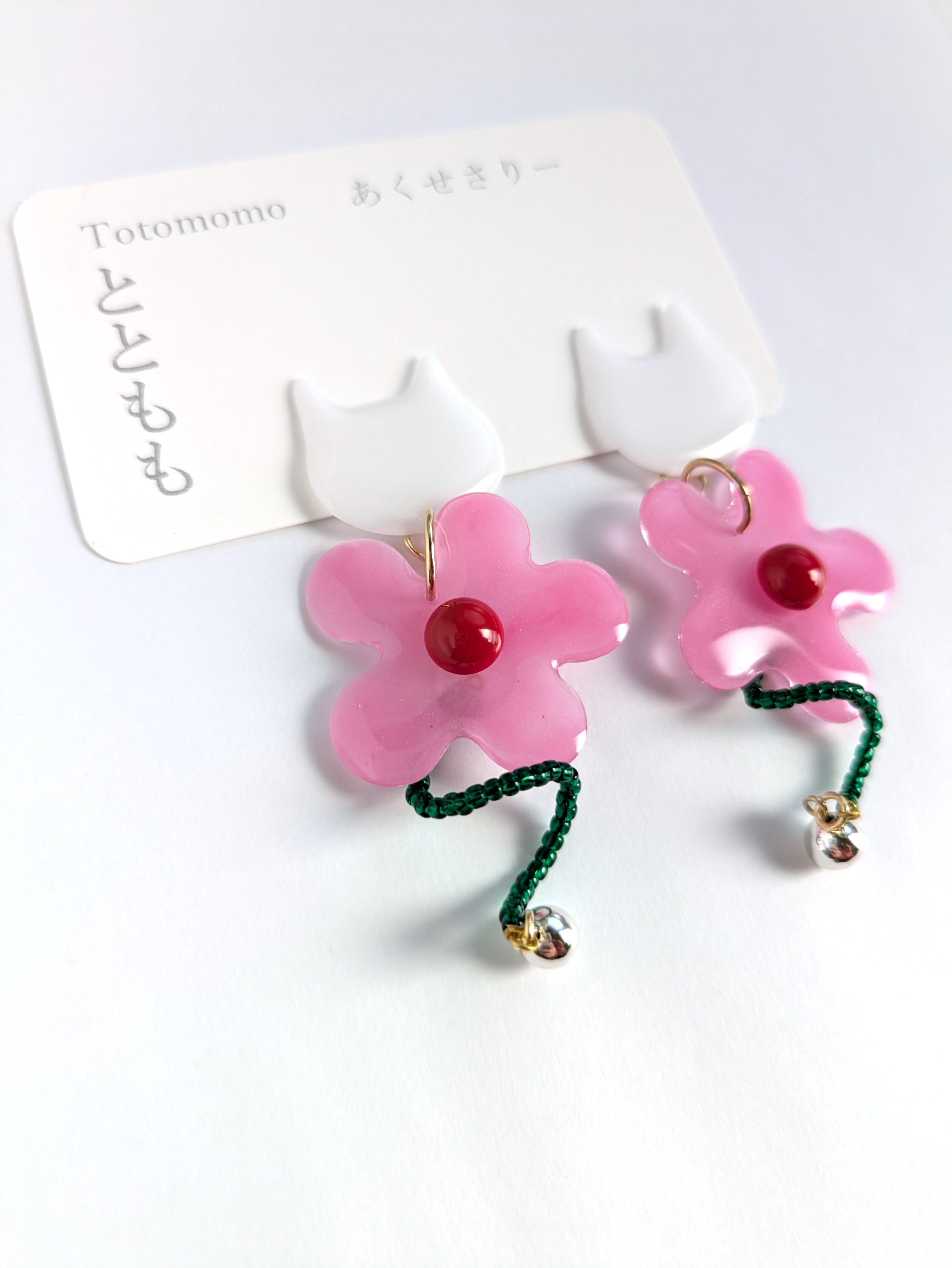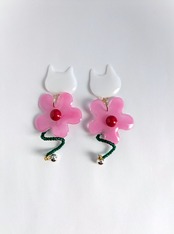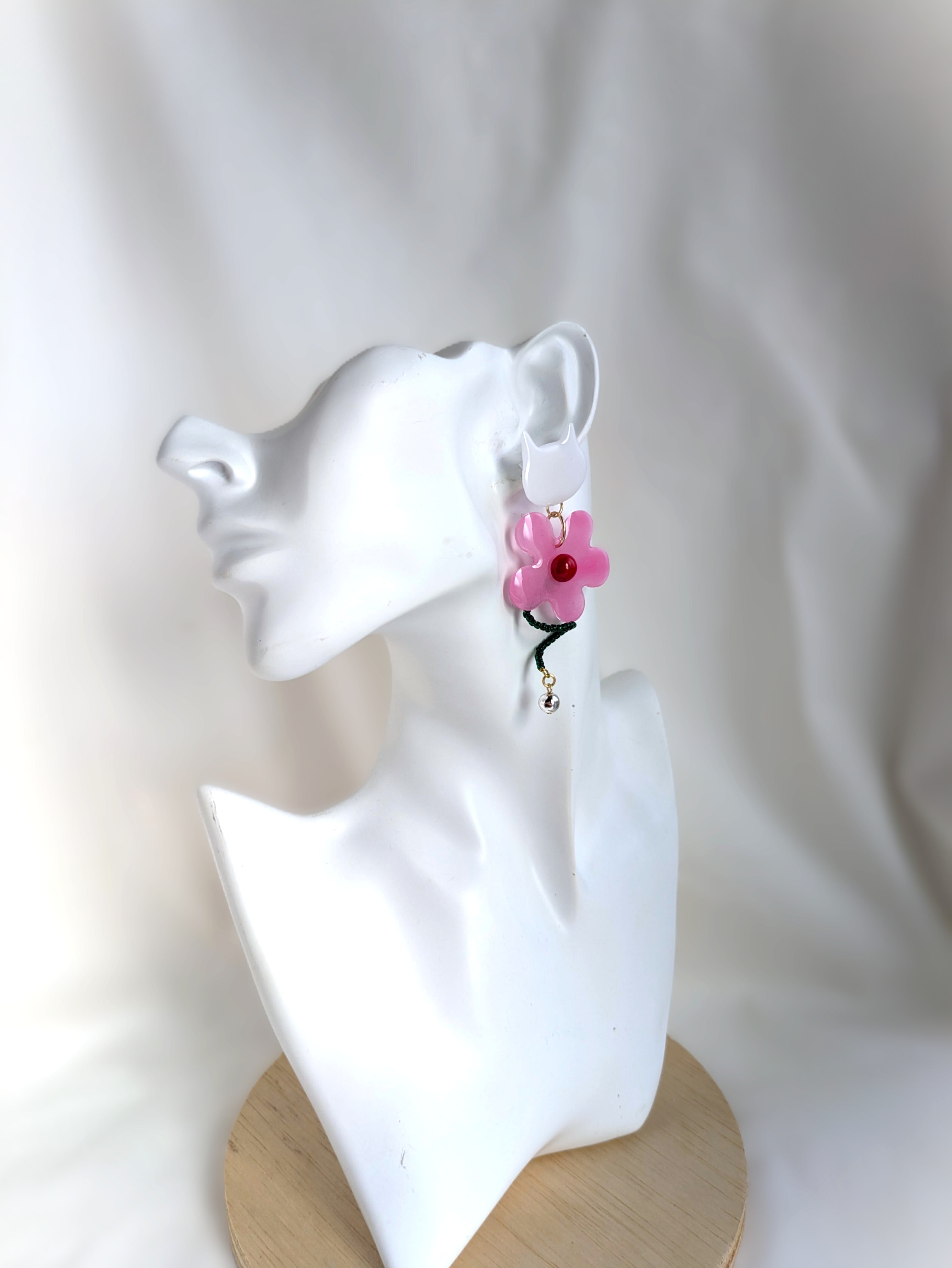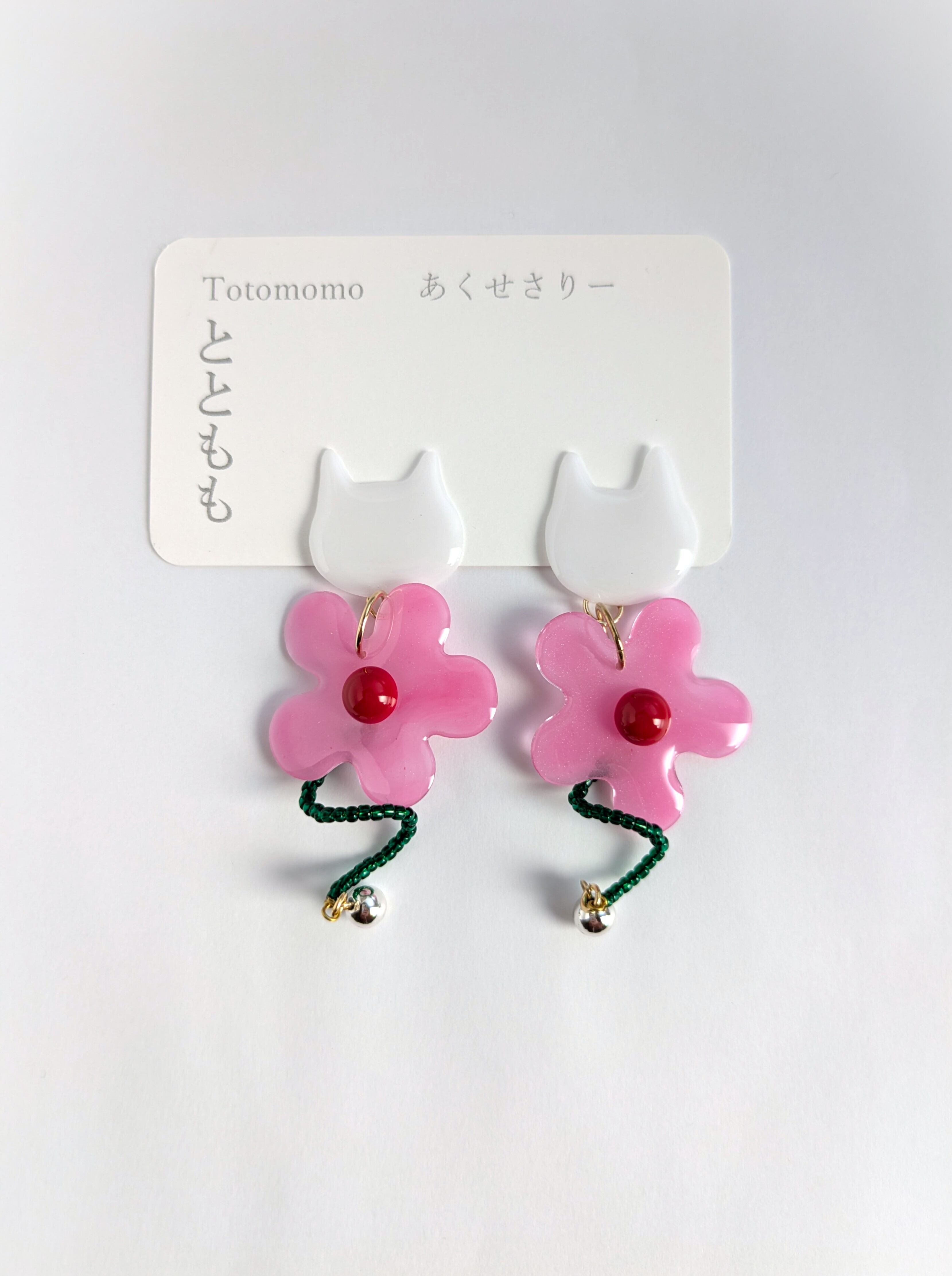 白いねことお花の耳飾り//White Cat and Flowers