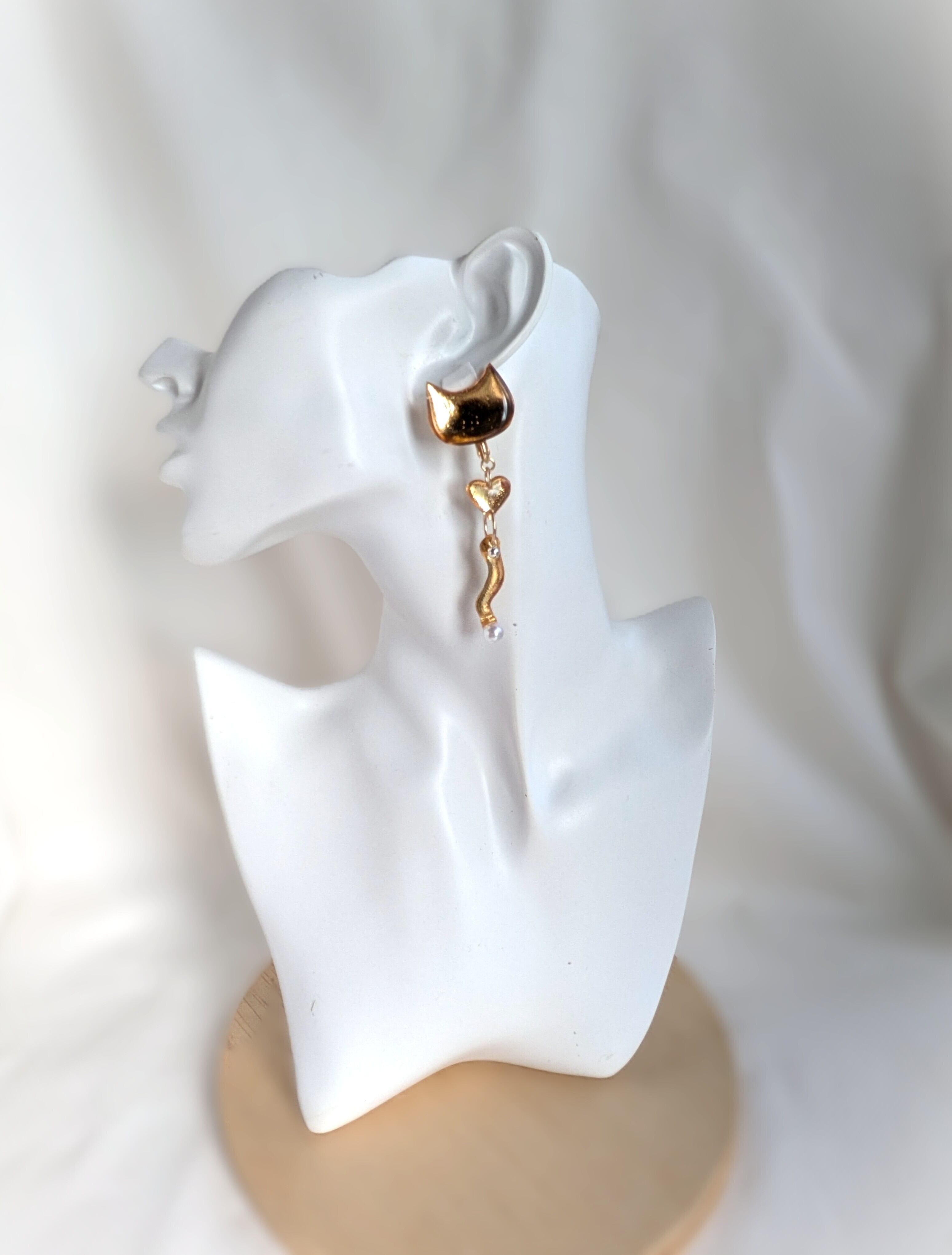 These gold-toned earrings give a cute yet sophisticated impression, while the playful tail adds an artistic touch. They add a perfect accent to simple outfits, making them ideal for any occasion.