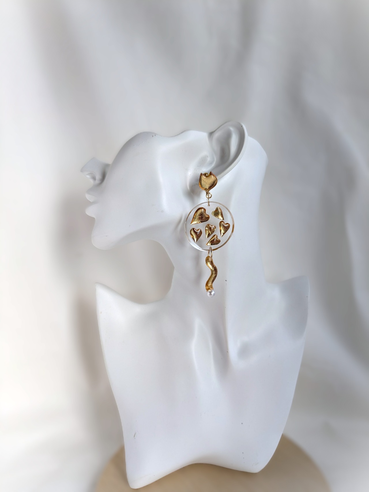 Acrylic light-curing resin, brass, faux gold leaf, acrylic pearls