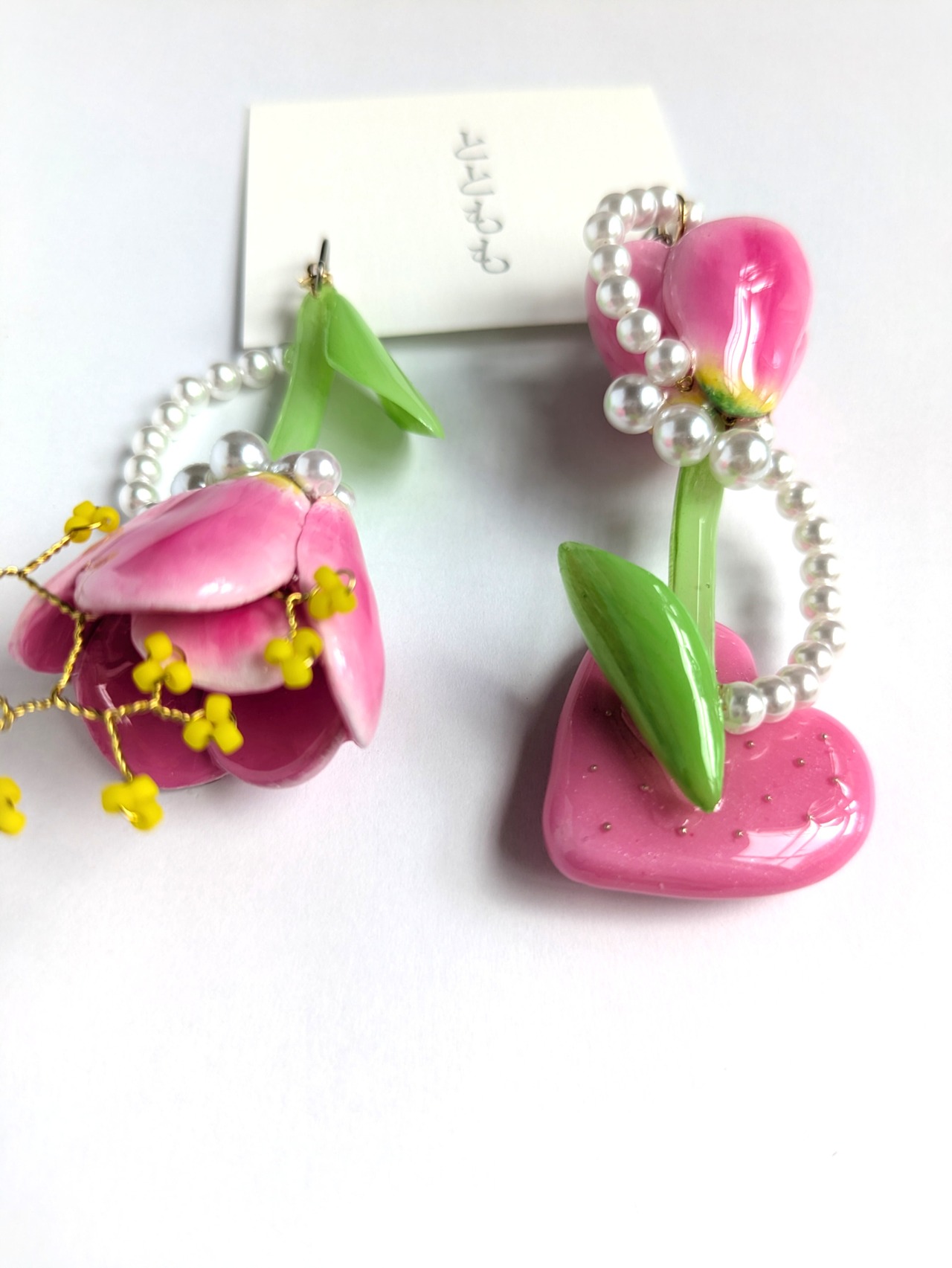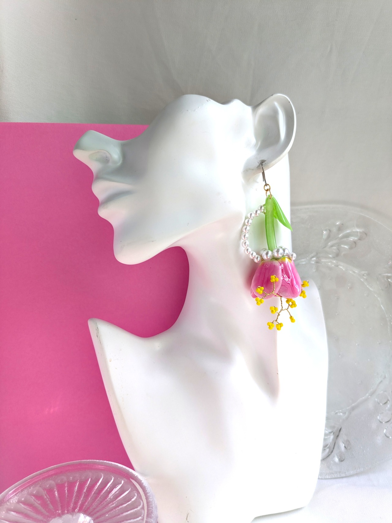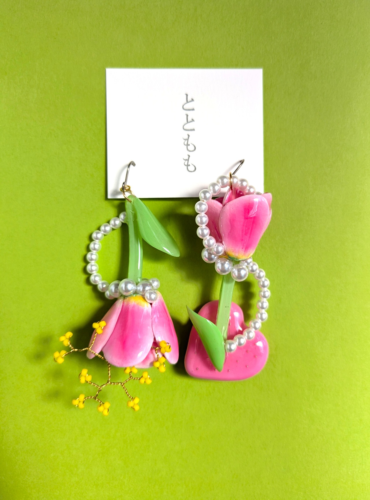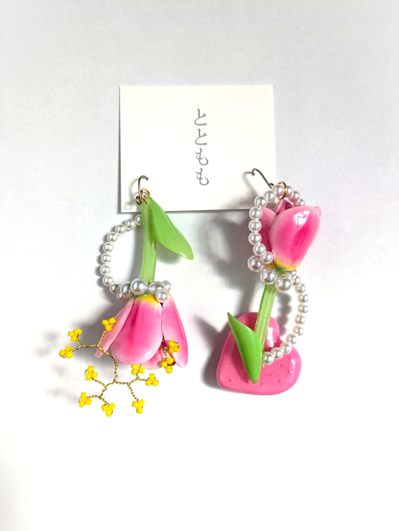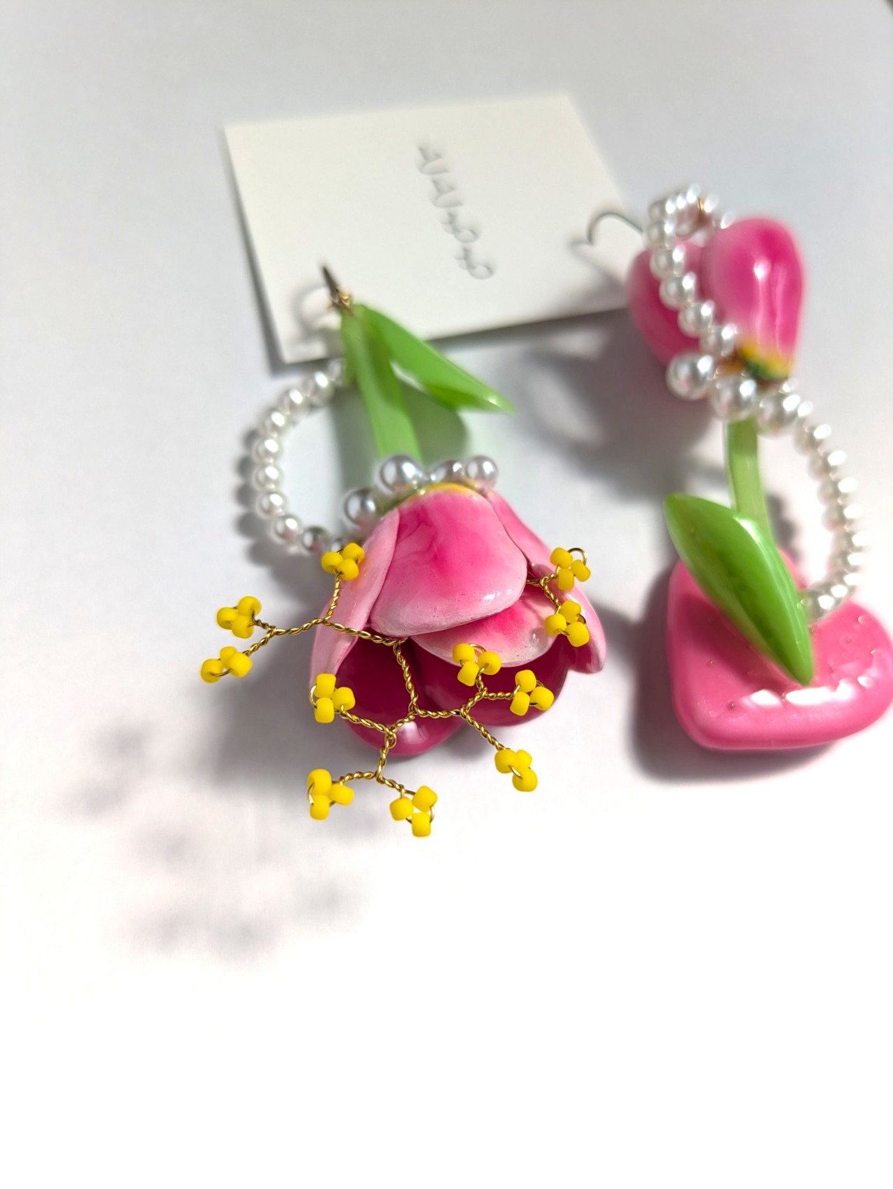 チューリップの周りにはパールを流れるようなデザインにあしらいました。
